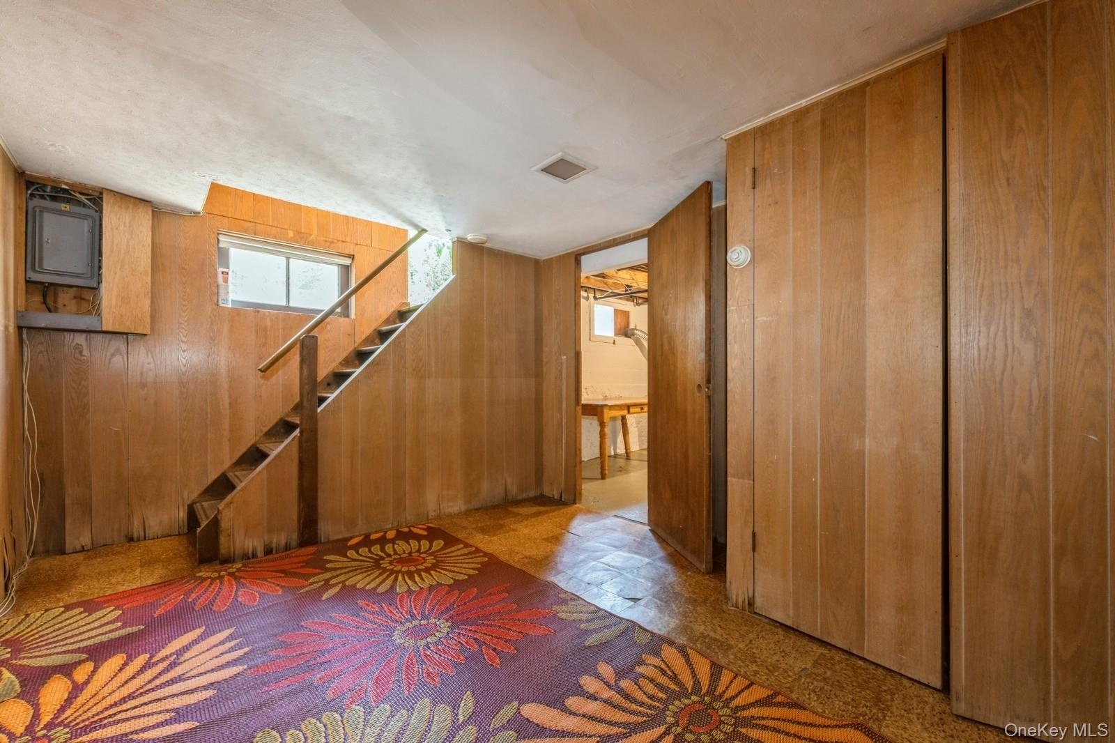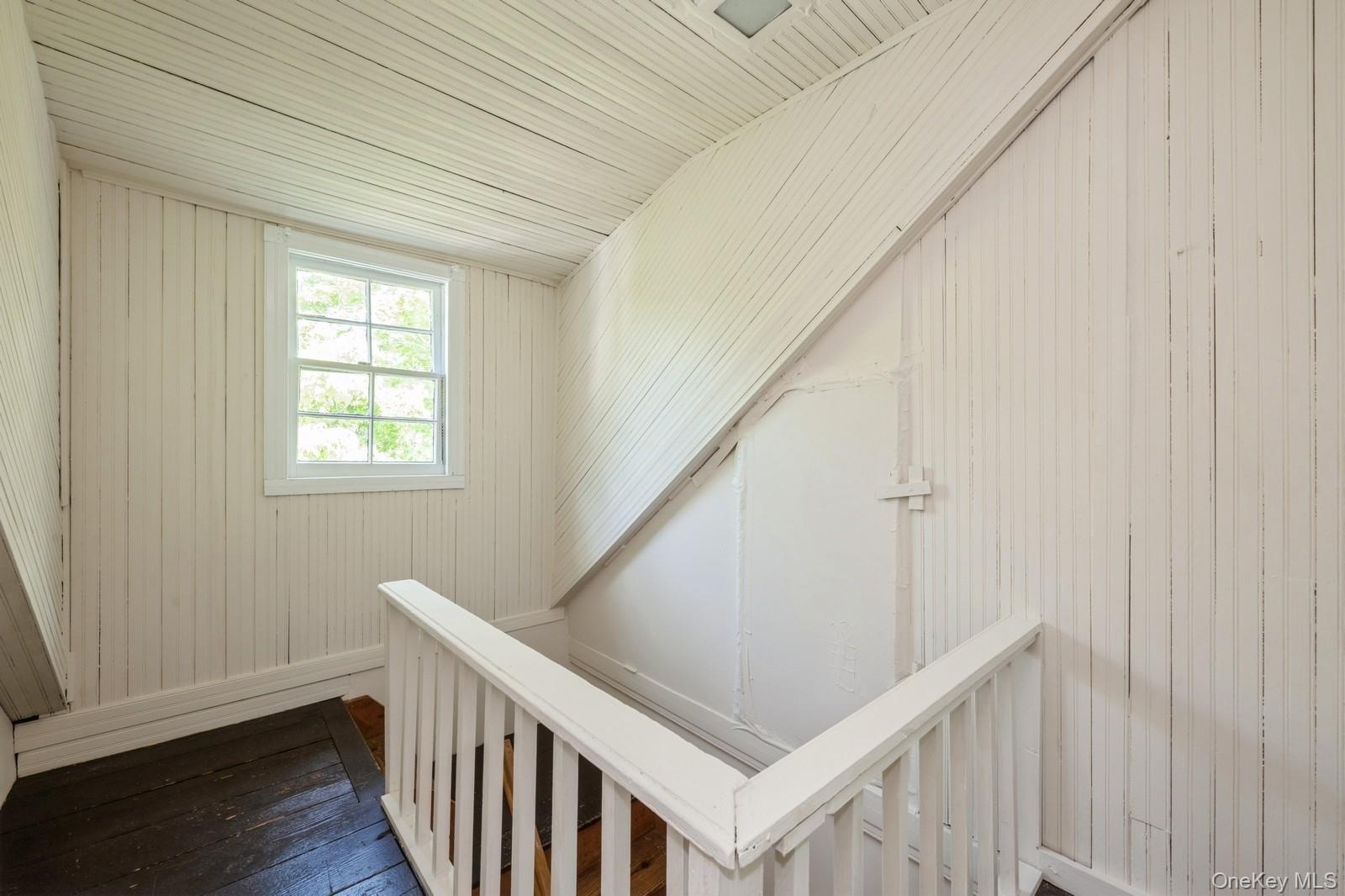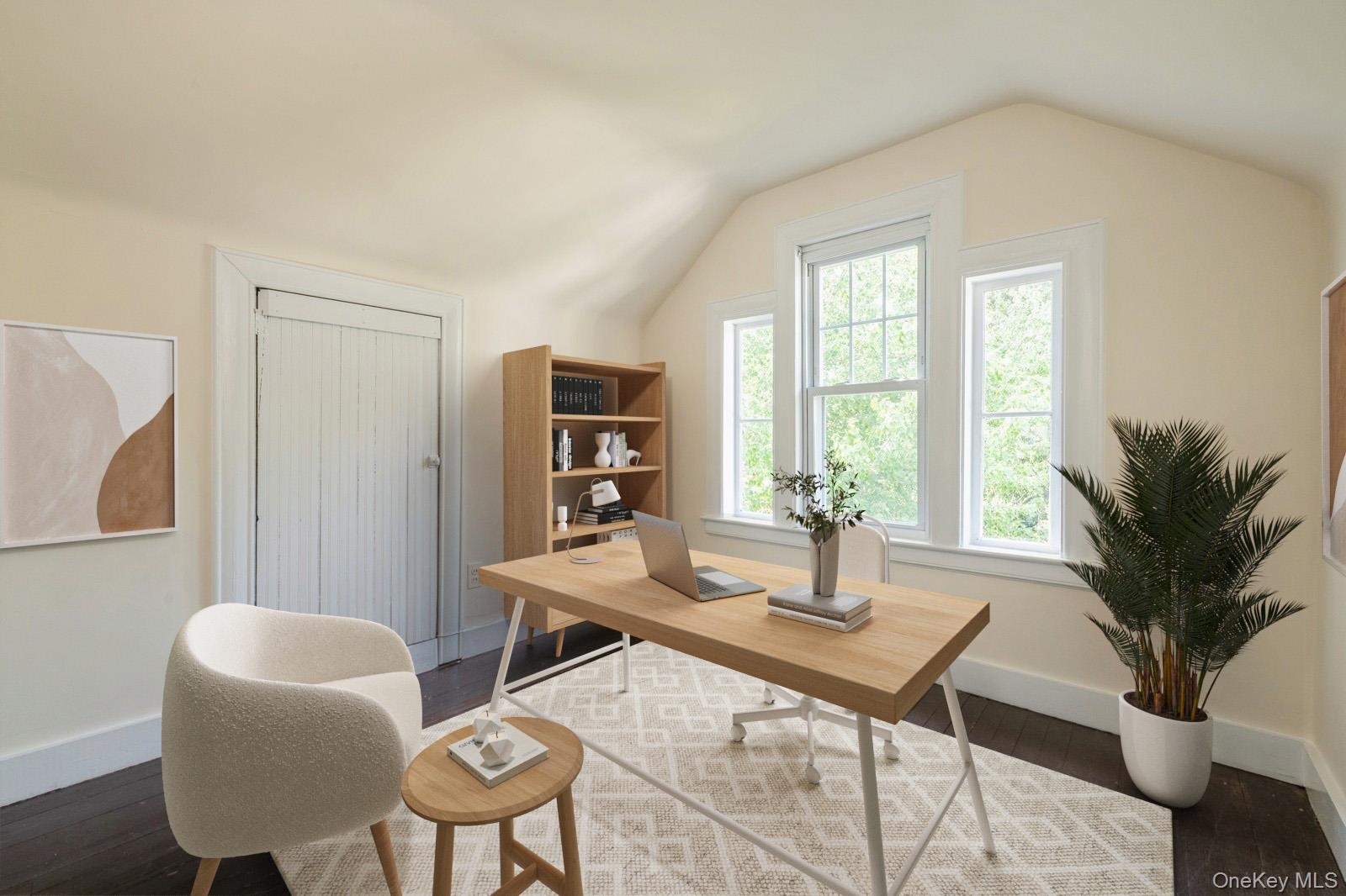 - Office space with vaulted ceiling and dark wood-style flooring, top floor