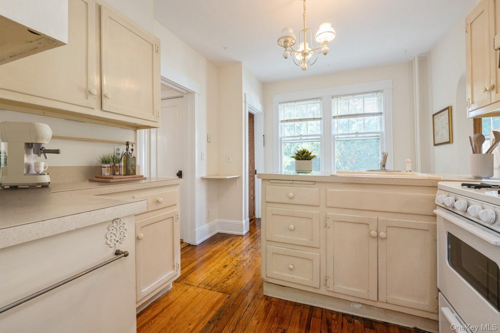 - Kitchen with white range with gas stovetop, light wood finished floors, light countertops, a chandelier, and a peninsula