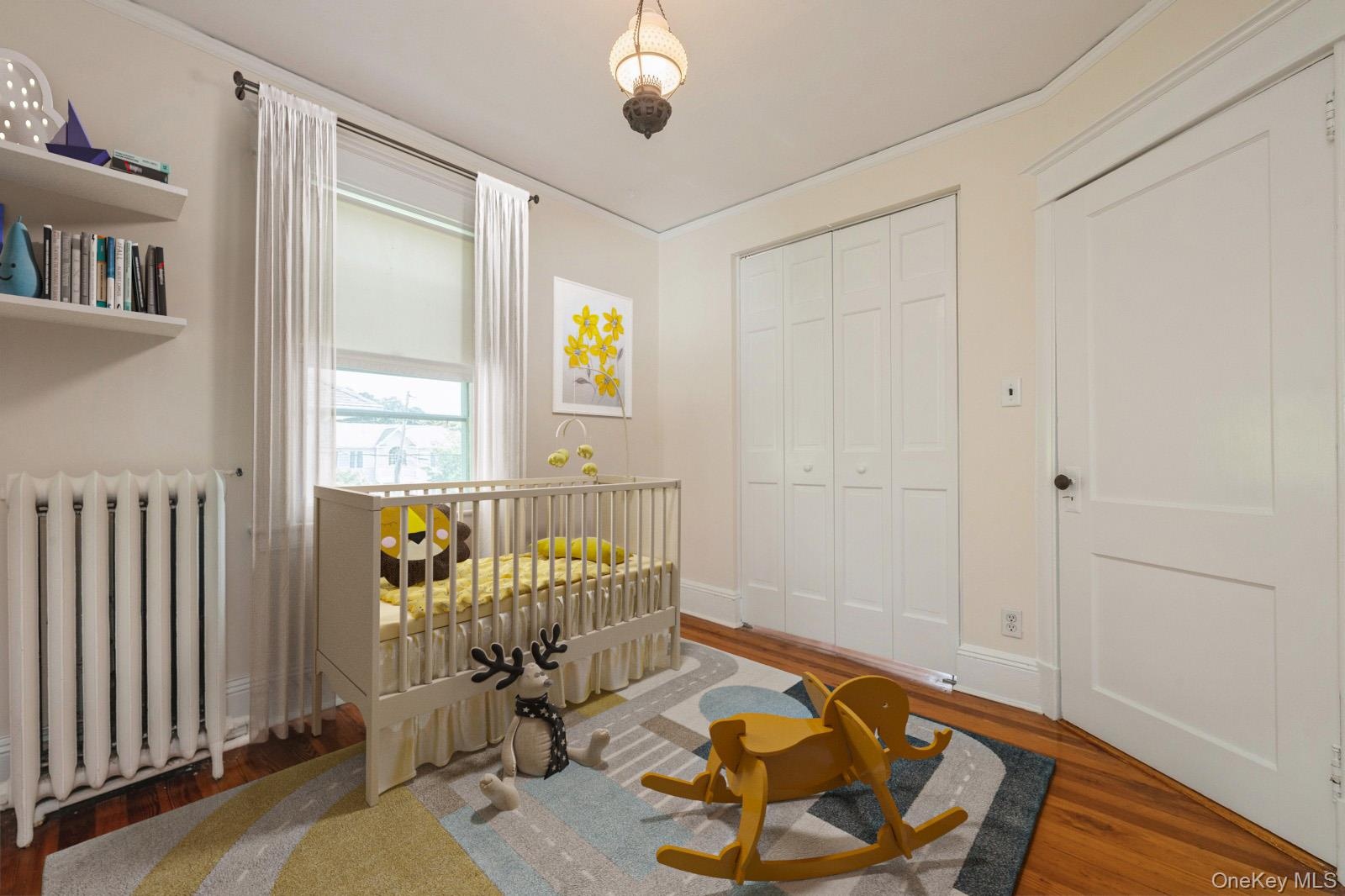 - Bedroom with radiator heating unit, wood finished floors, crown molding, and a closet