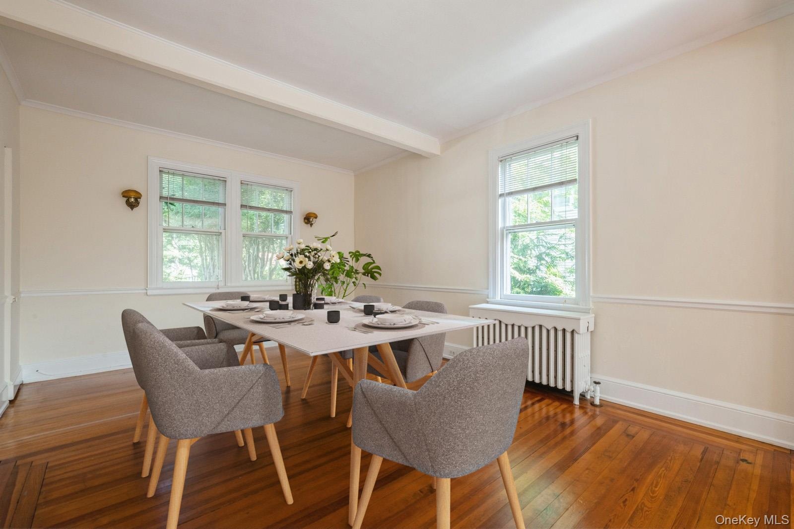 - Dining room featuring beamed ceiling, radiator, hardwood / wood-style floors, and crown molding