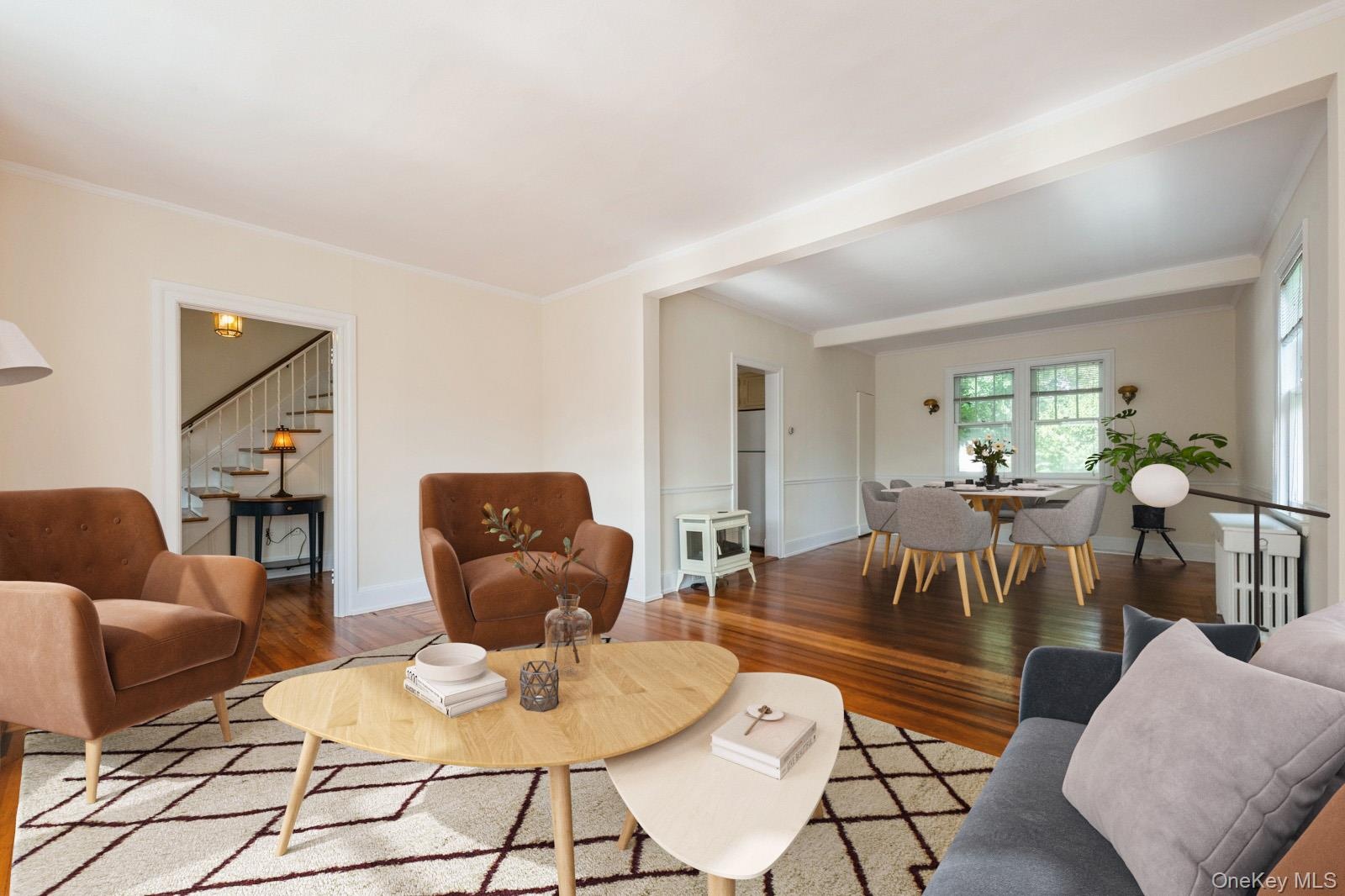 - Living area with wood finished floors, stairway, crown molding, and beamed ceiling