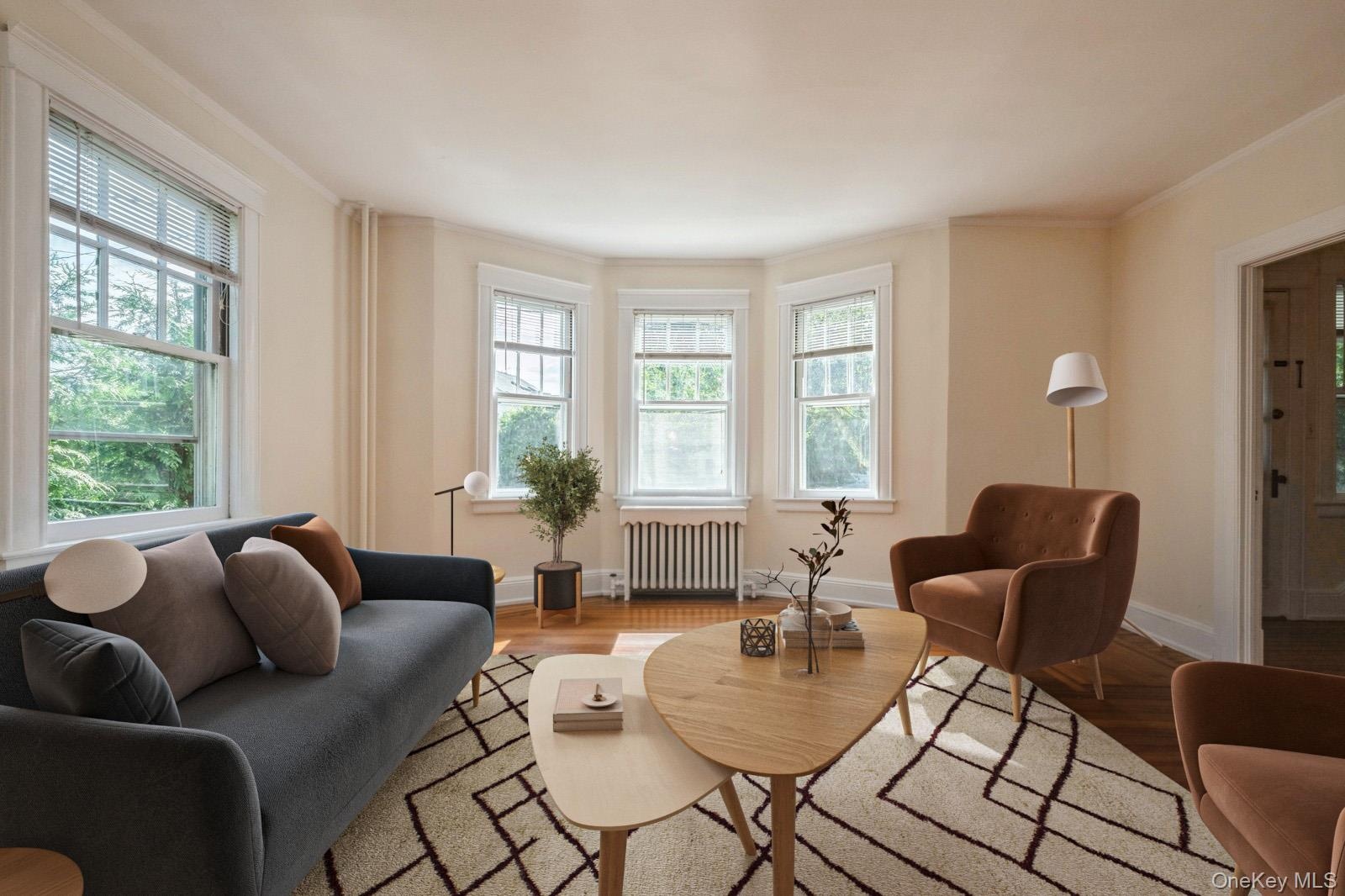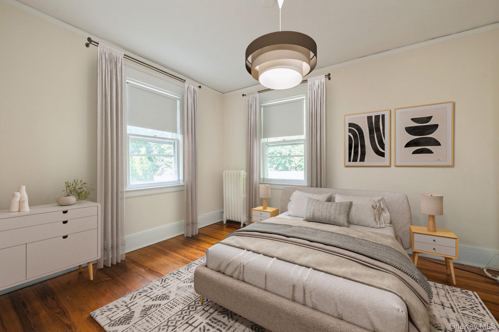 - Bedroom with ornamental molding, wood finished floors, and radiator
