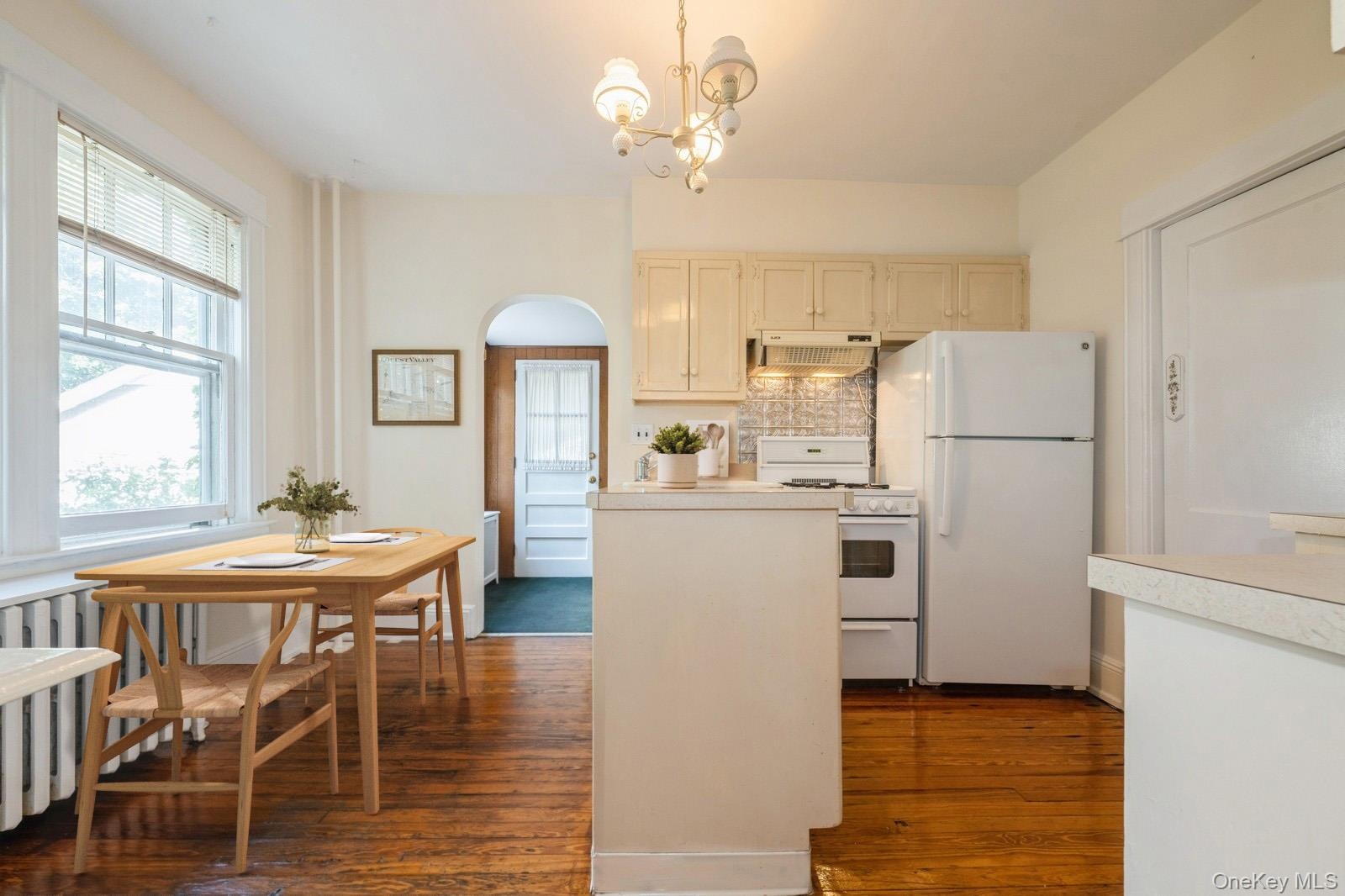- Kitchen featuring white appliances, arched walkways, tasteful backsplash, and light countertops