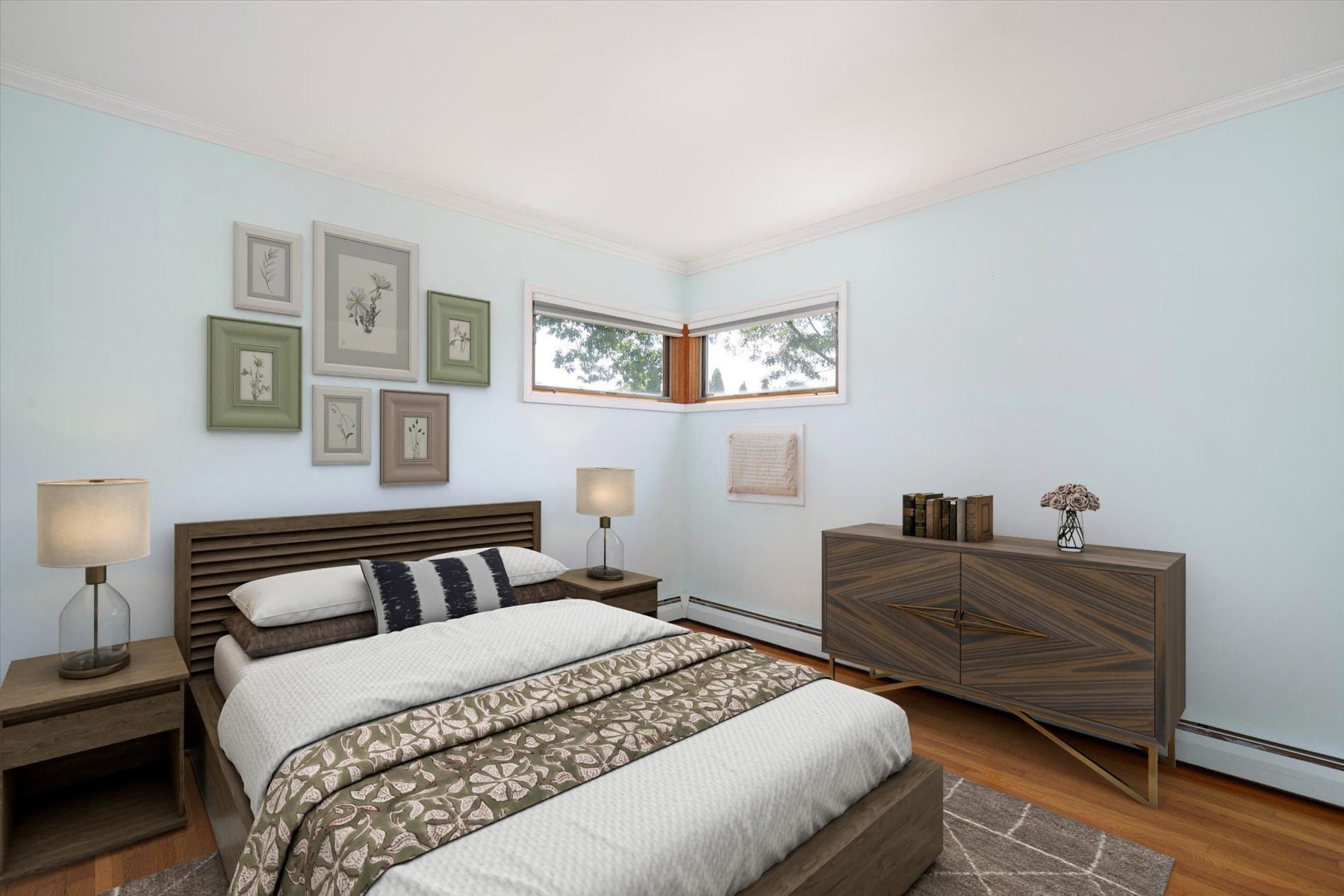 - Bedroom with ornamental molding, wood finished floors, and a baseboard heating unit