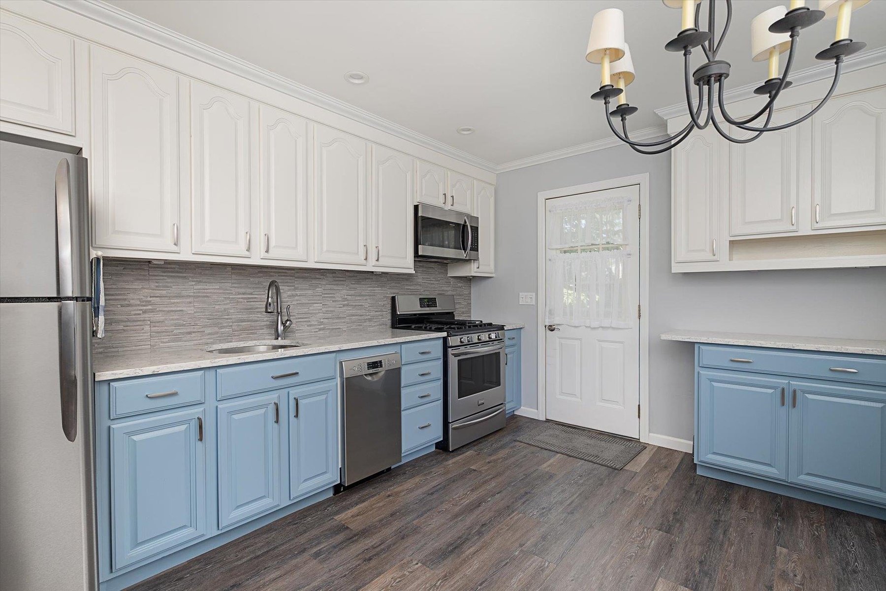 - Kitchen featuring blue cabinets, stainless steel appliances, dark wood-style floors, tasteful backsplash, and white cabinetry