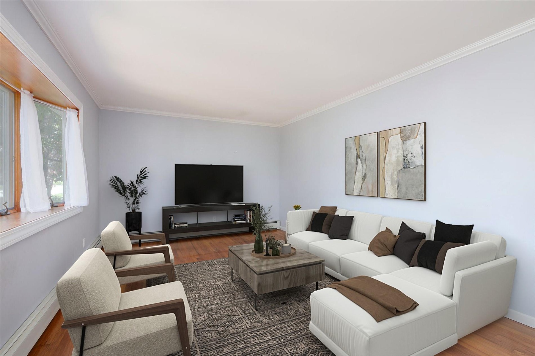 - Living room featuring ornamental molding, wood finished floors, and a baseboard heating unit