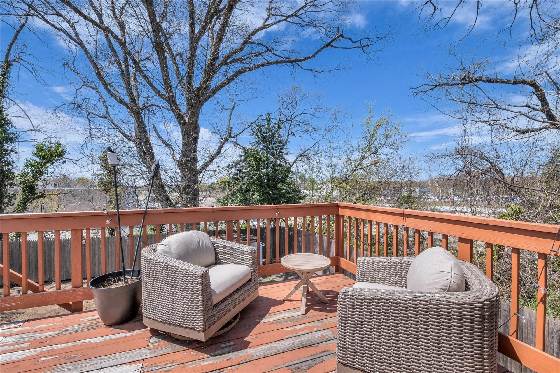 - Back of property with a wooden deck, stairway, a fenced backyard, and a chimney