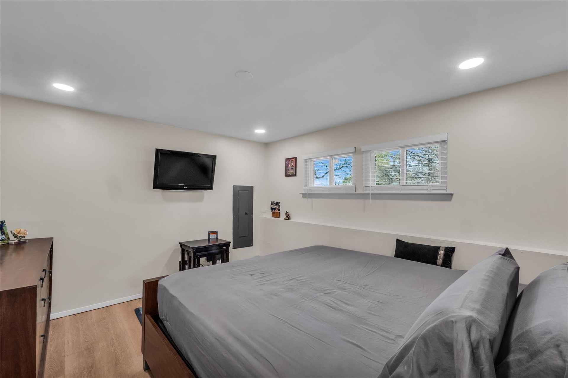 - Bedroom with recessed lighting, electric panel, baseboards, and light wood-type flooring