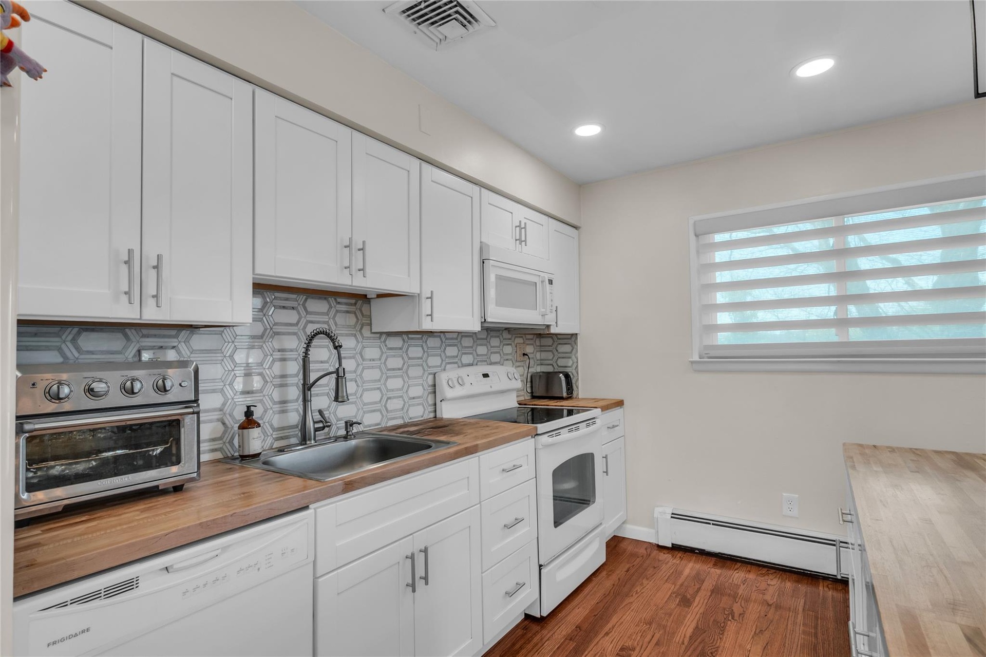- Kitchen featuring white appliances, a baseboard radiator, butcher block counters, a sink, and visible vents