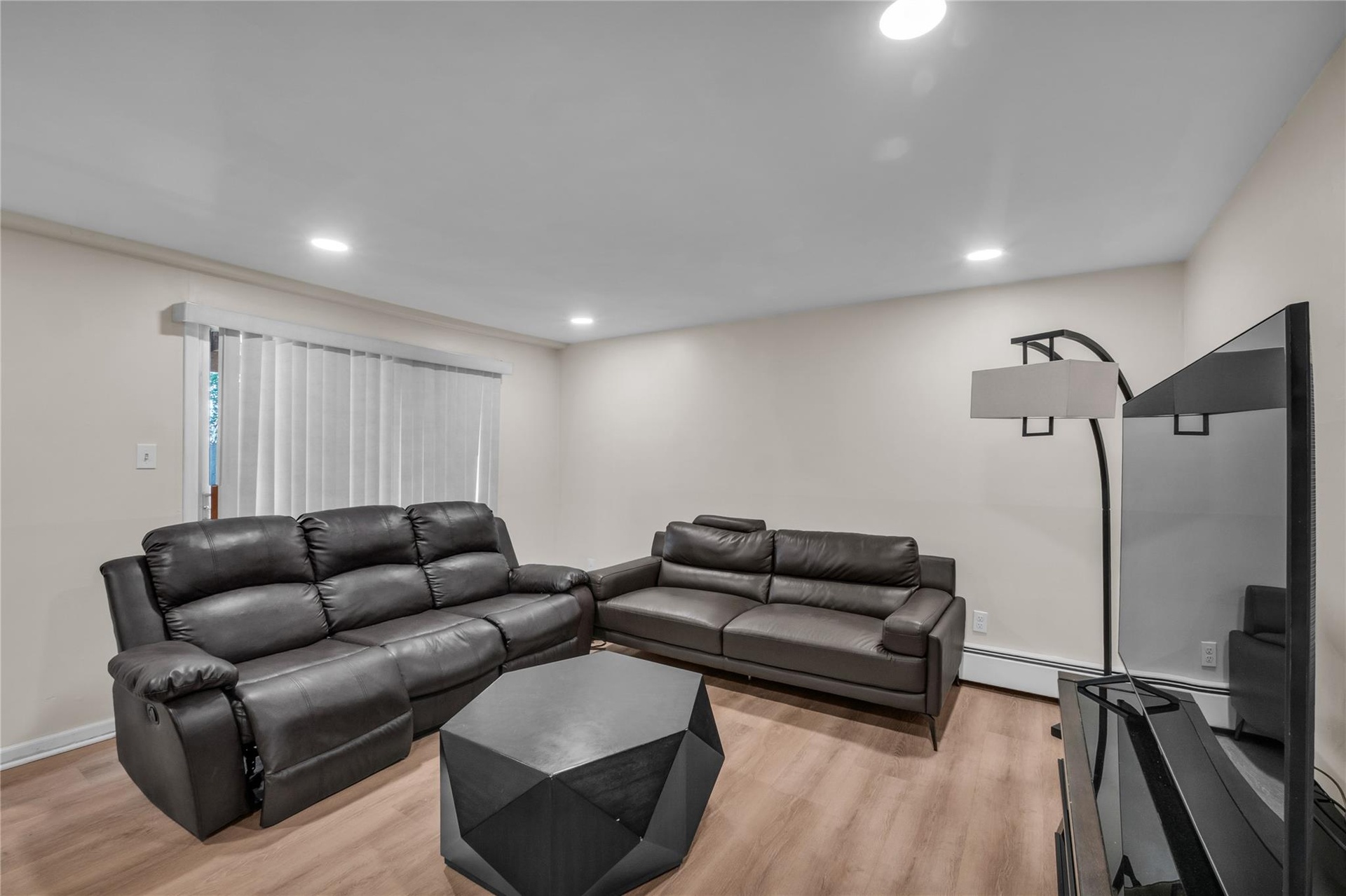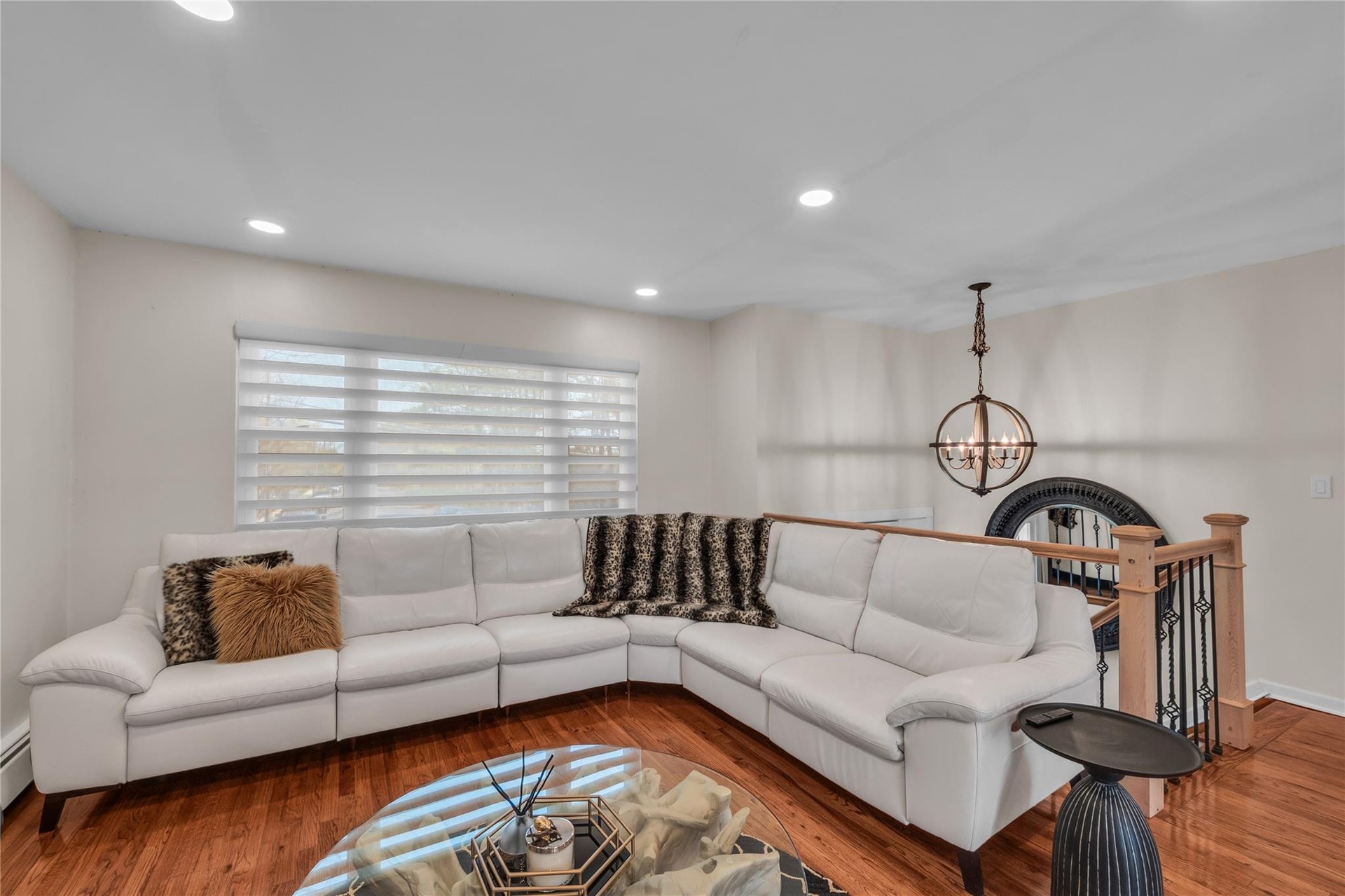 - Living area featuring an inviting chandelier, wood finished floors, recessed lighting, and a baseboard heating unit