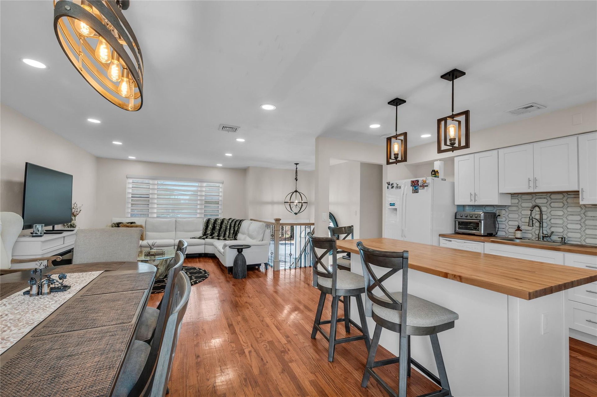 - Kitchen featuring visible vents, a sink, white refrigerator with ice dispenser, and butcher block counters
