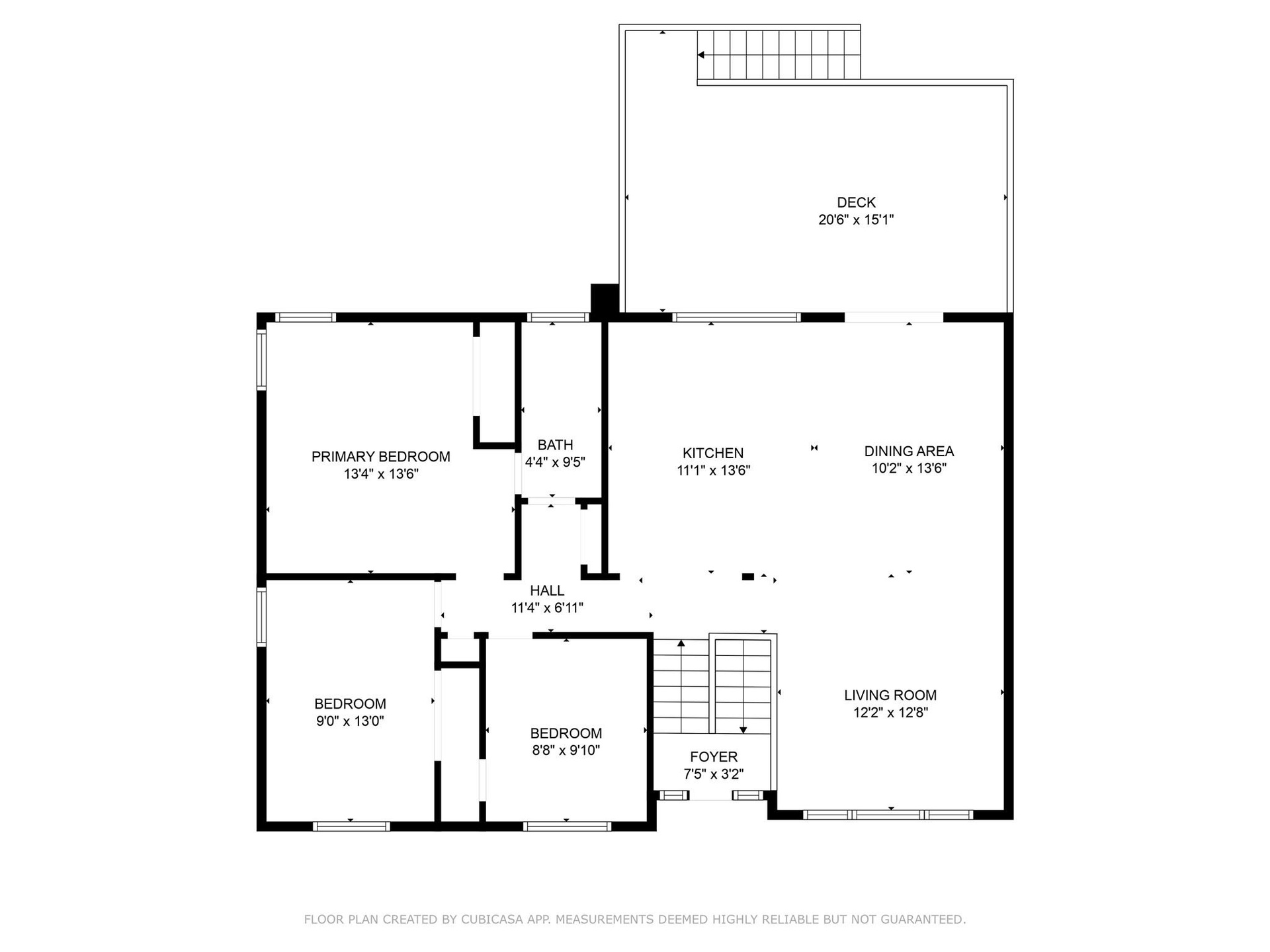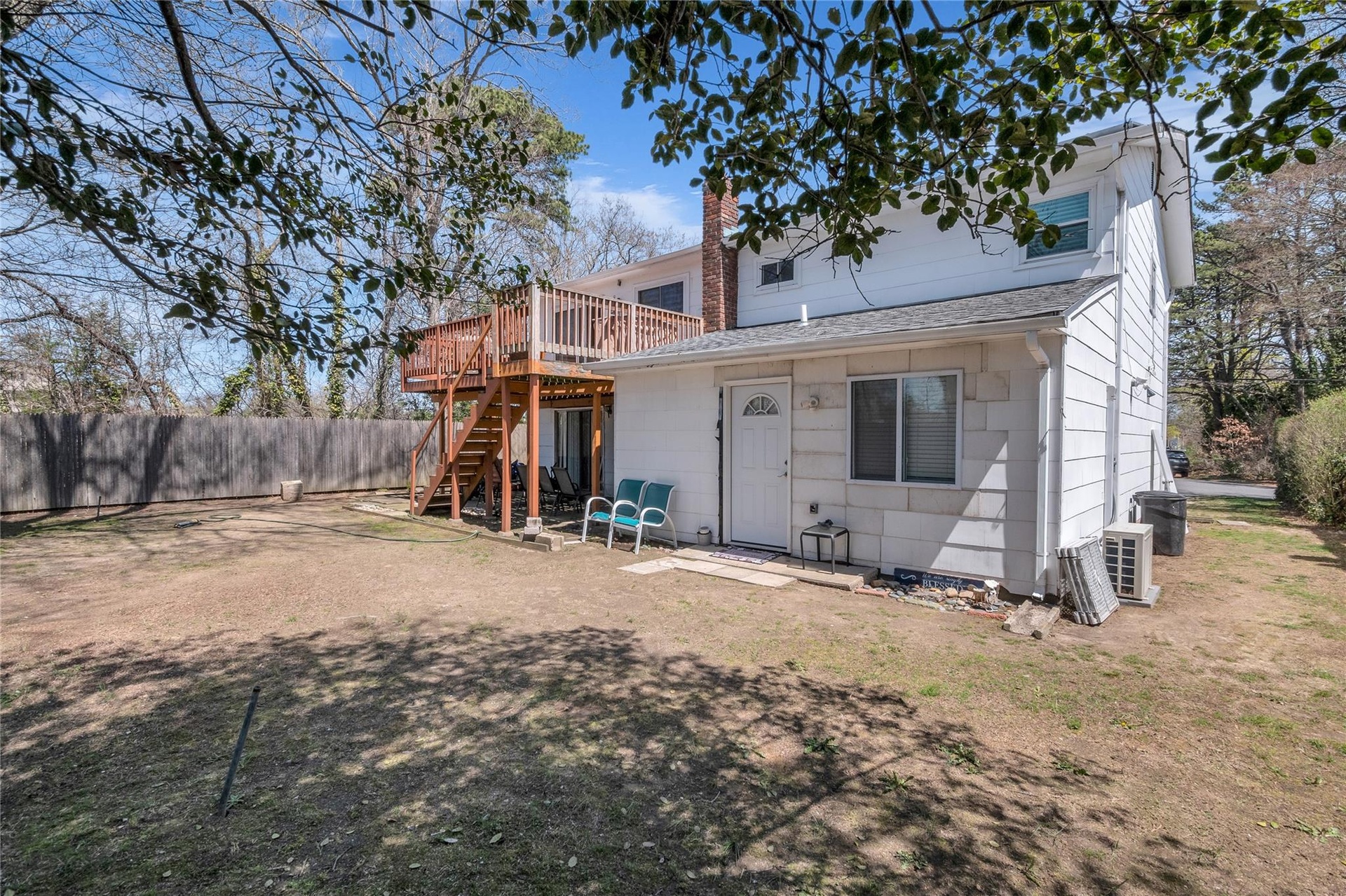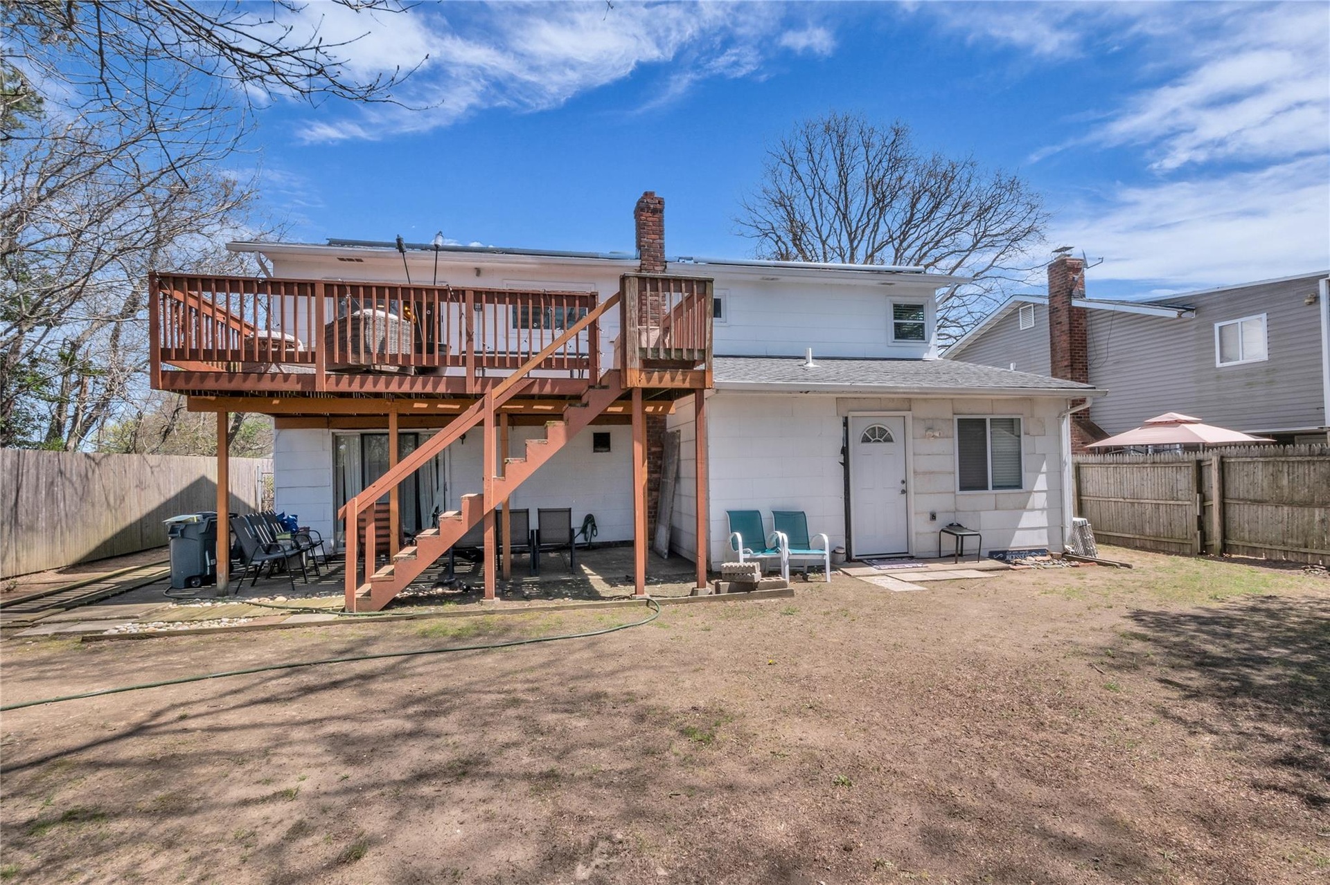 - Rear view of property featuring a wooden deck, stairway, fence, and a chimney