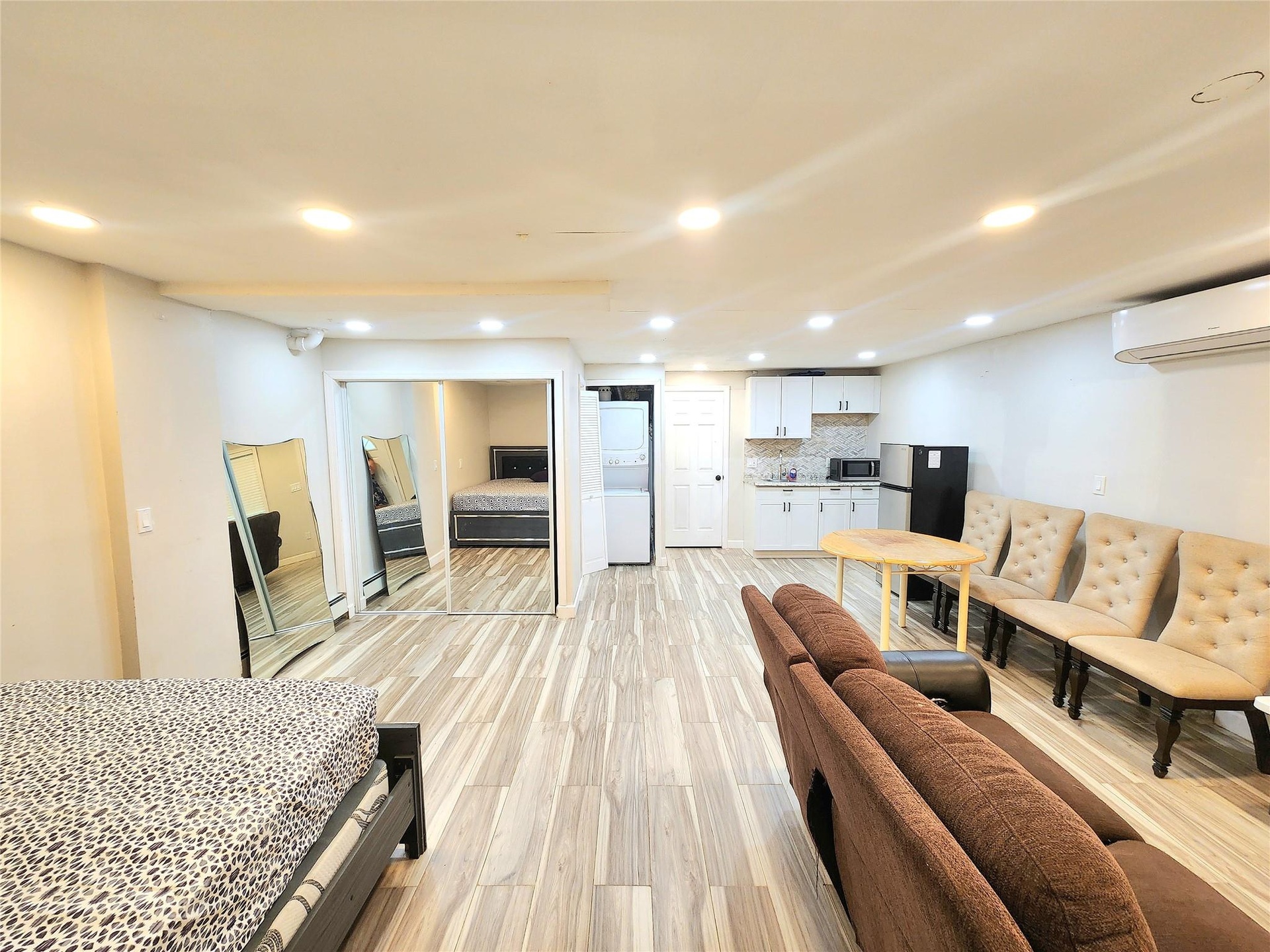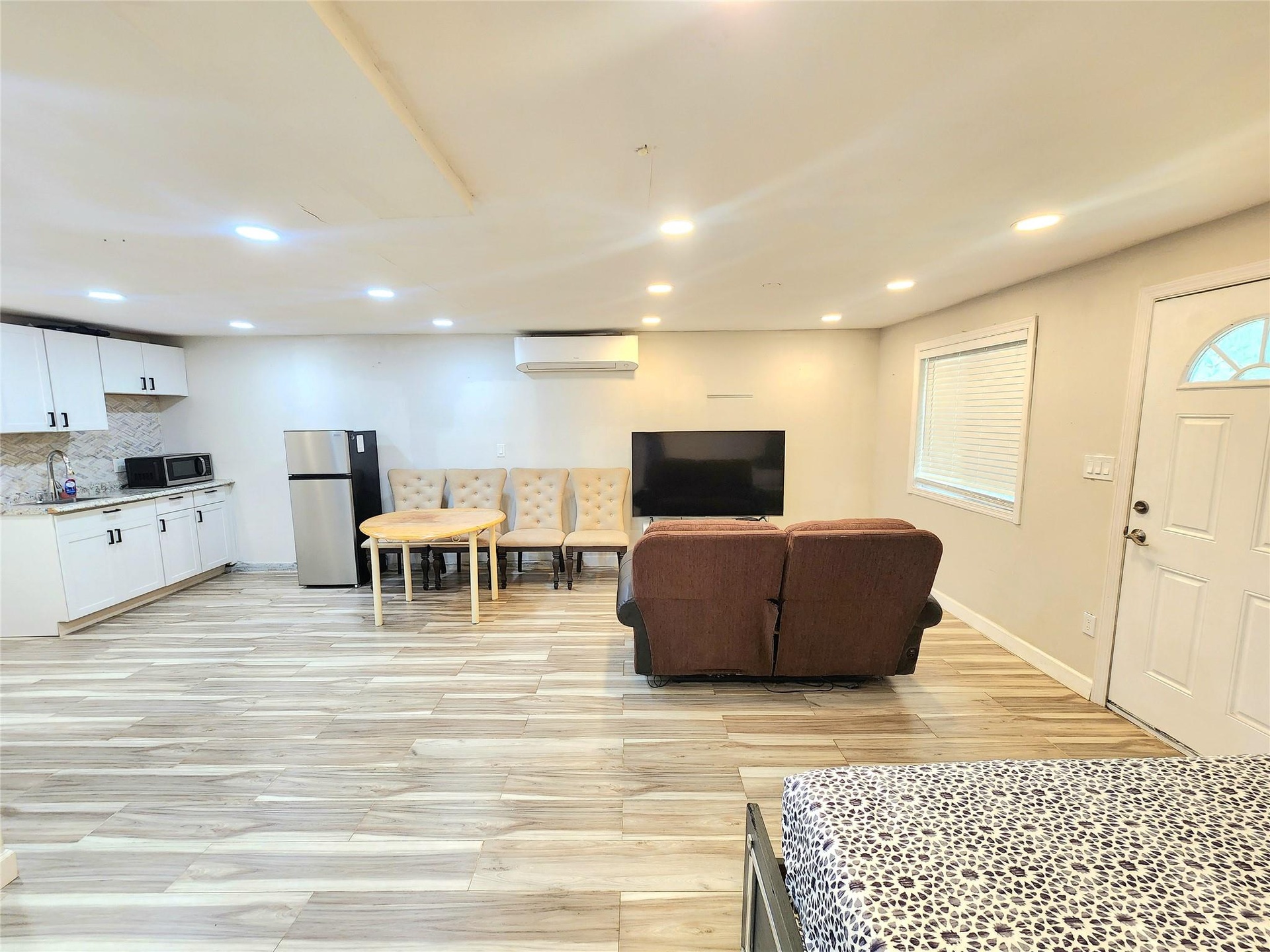 - Living area featuring a wall unit AC, recessed lighting, and light wood-style flooring