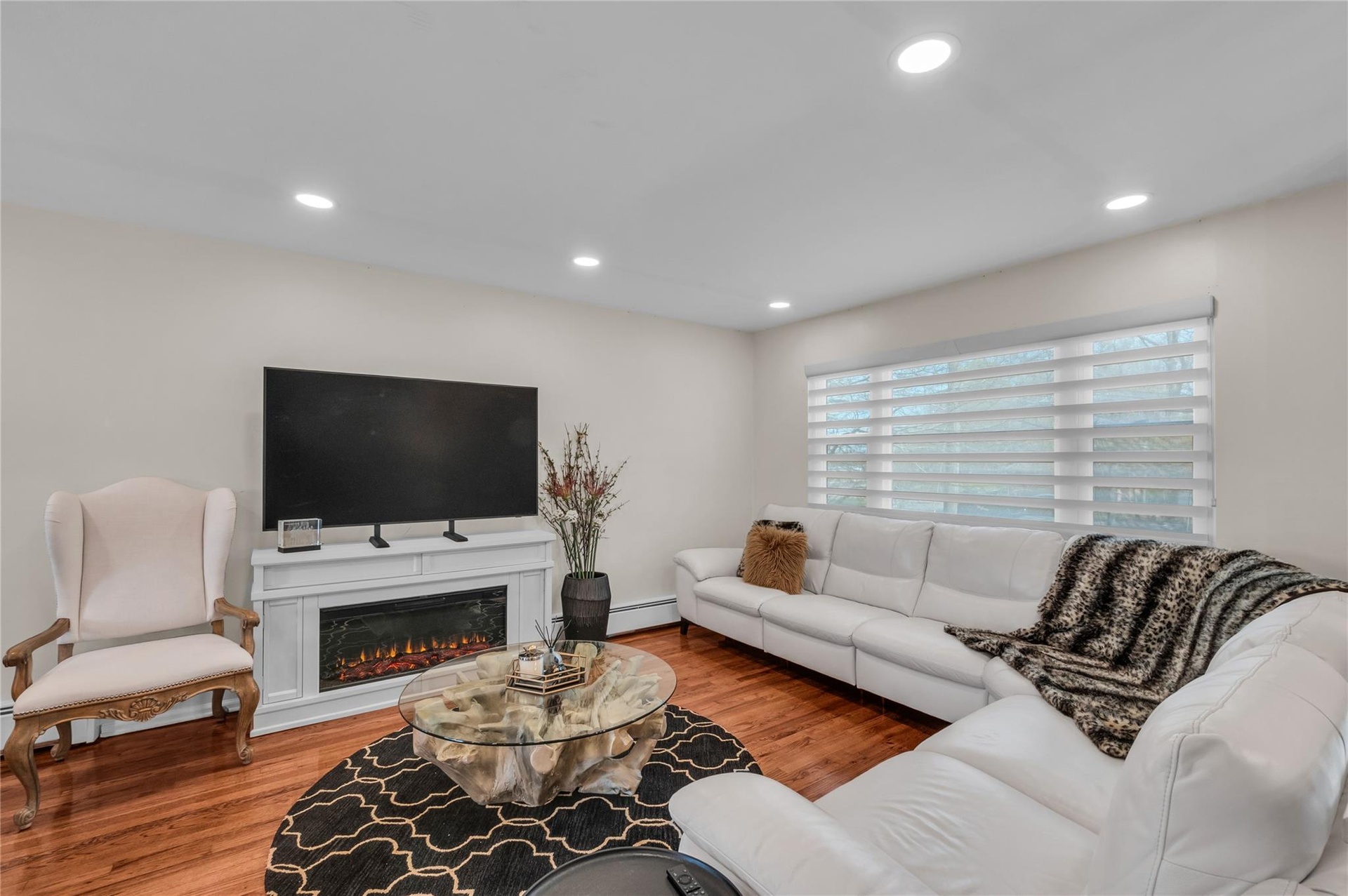 - Living room featuring wood finished floors, recessed lighting, baseboard heating, and a warm lit fireplace