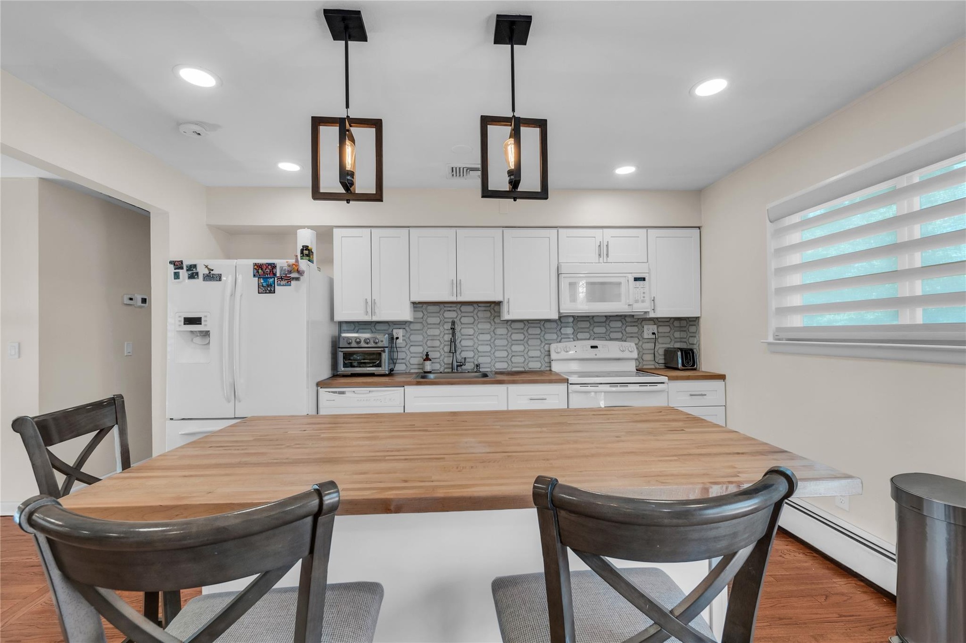 - Kitchen featuring white appliances, butcher block countertops, decorative light fixtures, a baseboard heating unit, and white cabinets