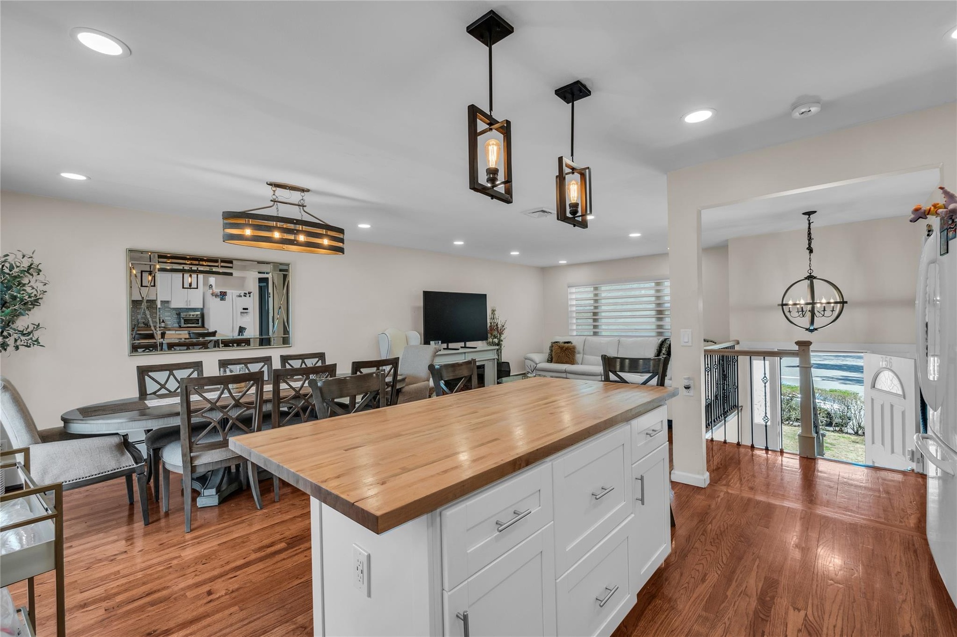 - Kitchen with white cabinets, an inviting chandelier, wood counters, and dark wood-type flooring