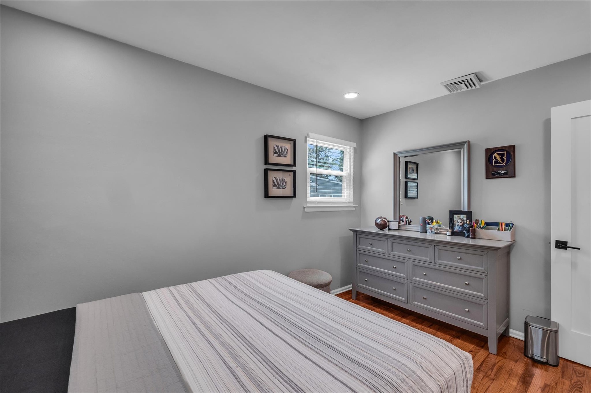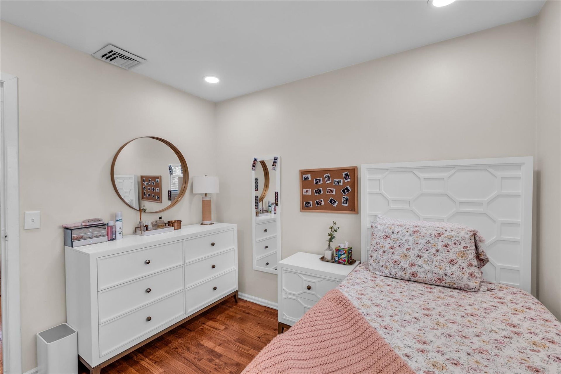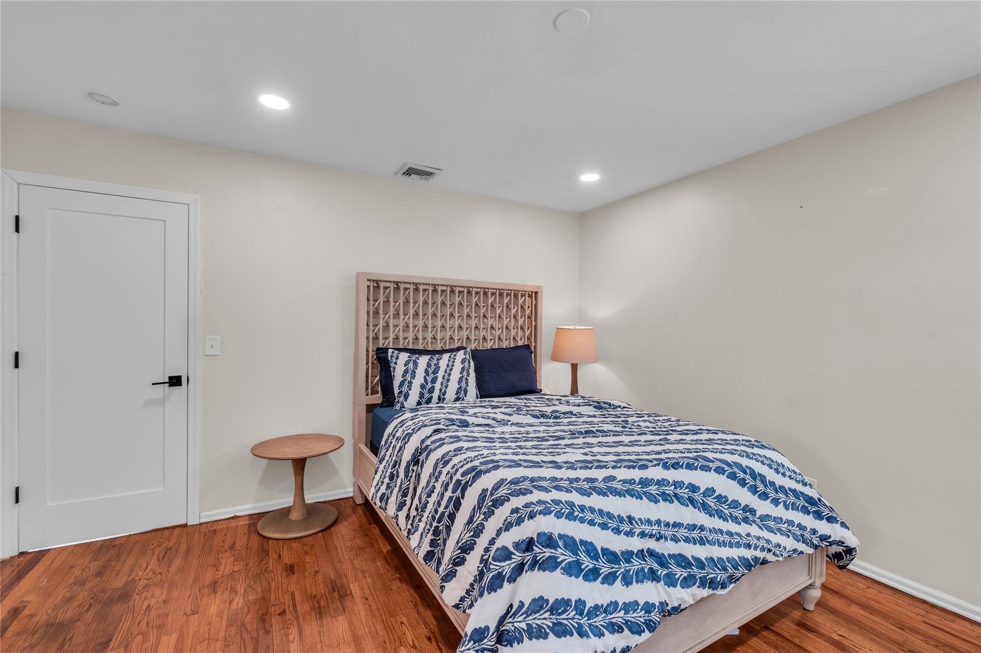 - Bedroom with wood finished floors, recessed lighting, visible vents, and baseboards
