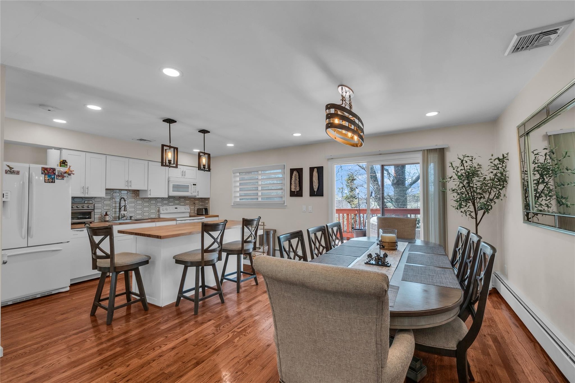 - Dining area featuring a baseboard heating unit, recessed lighting, visible vents, and wood finished floors