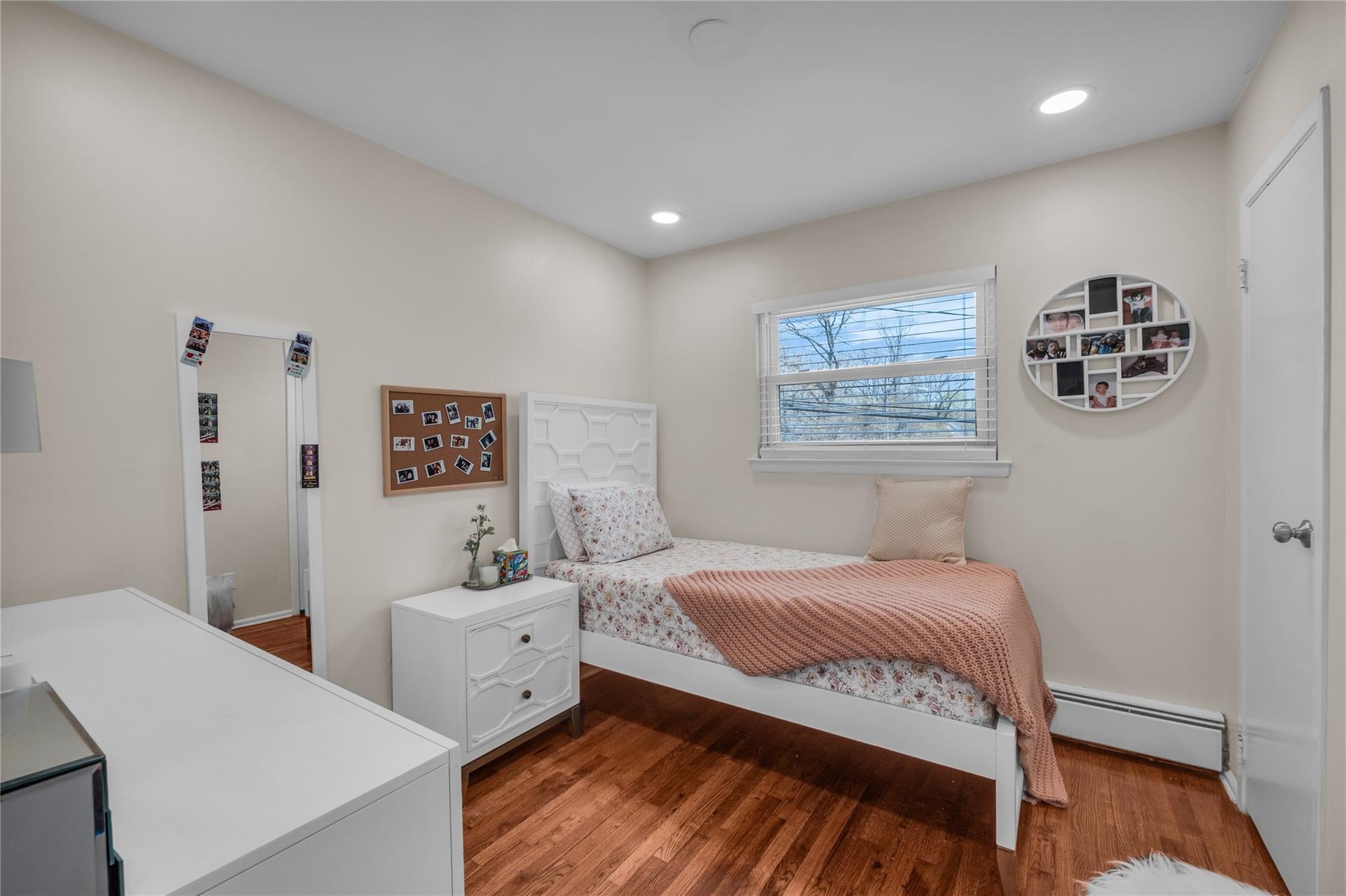 - Bedroom featuring baseboards, recessed lighting, wood finished floors, and a baseboard heating unit