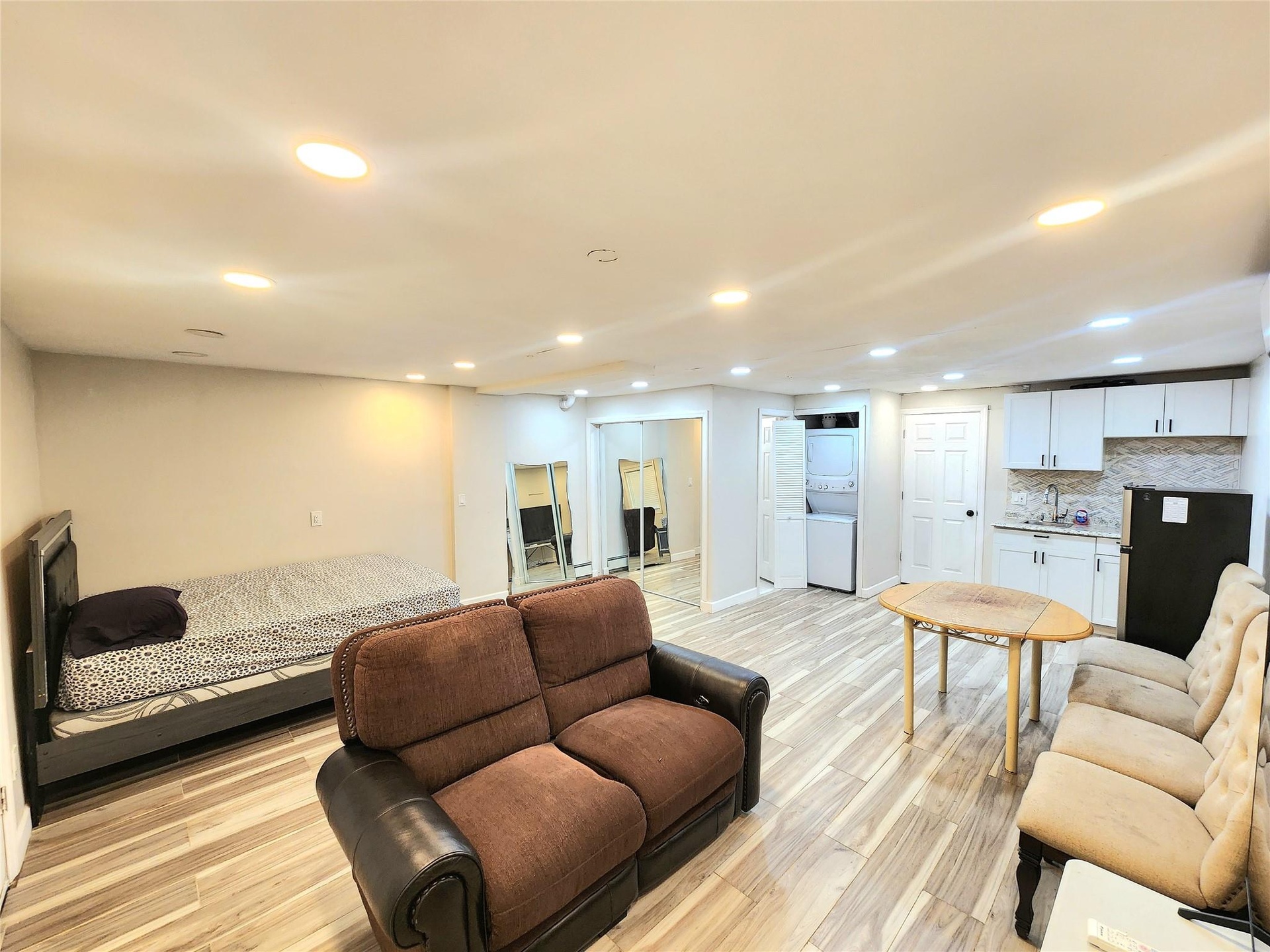 - Living room featuring recessed lighting, light wood-style flooring, and bar