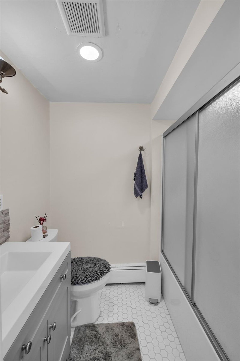 - Full bath featuring a baseboard heating unit, shower / bath combination with glass door, toilet, vanity, and visible vents
