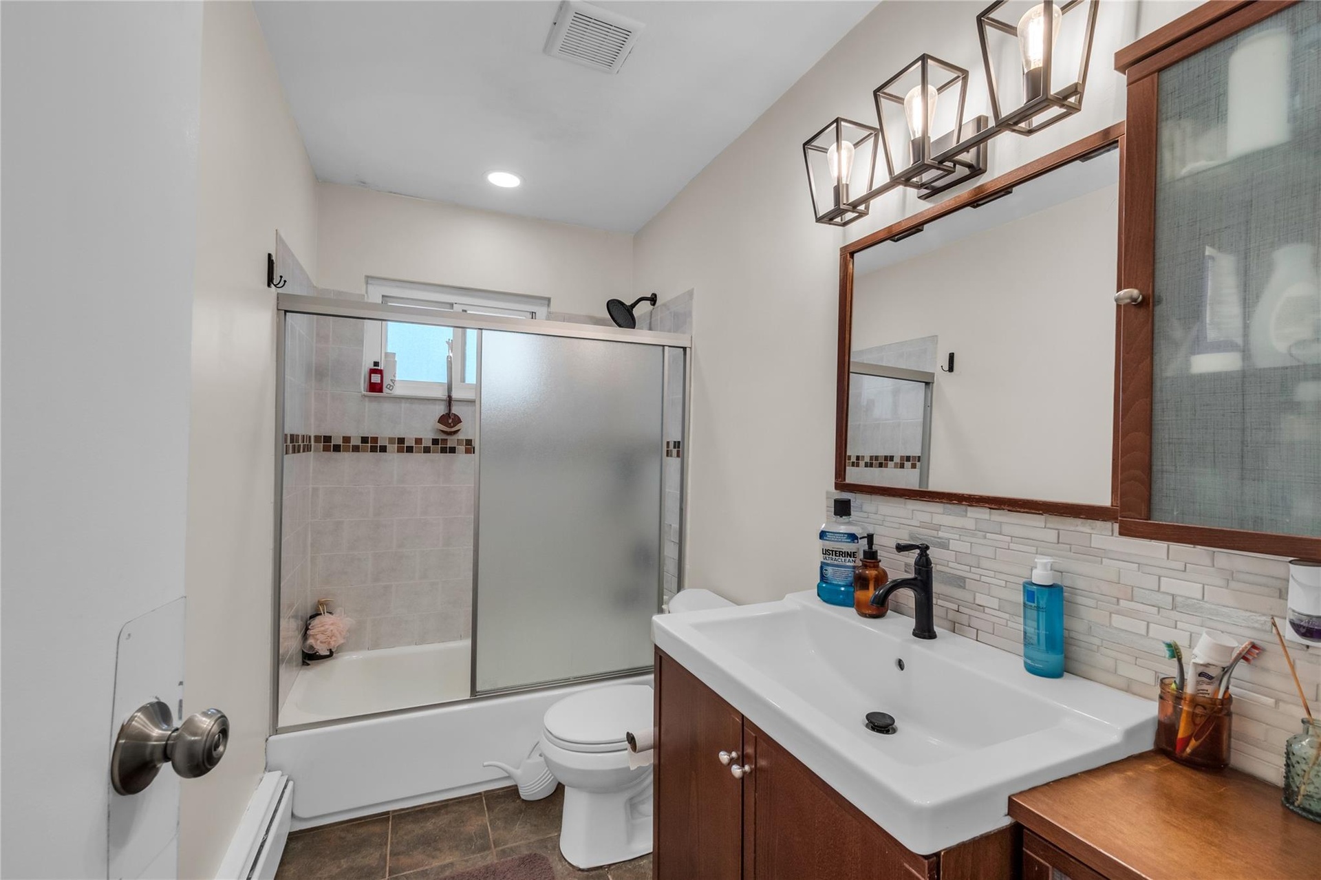 - Full bath featuring vanity, tasteful backsplash, toilet, visible vents, and baseboard heating