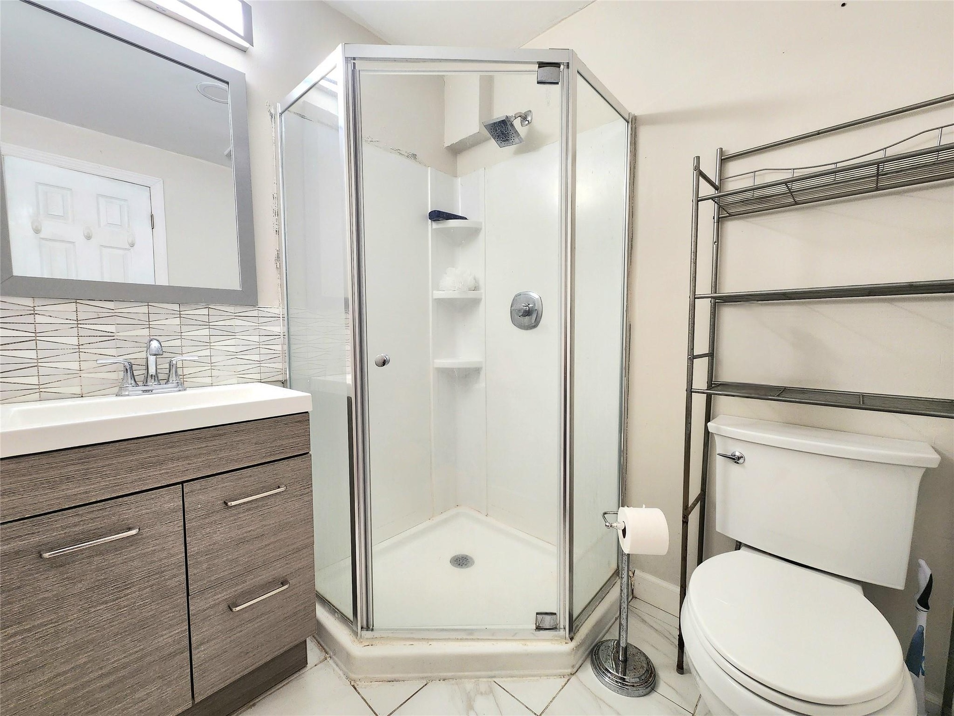 - Bathroom featuring a shower stall, vanity, and tasteful backsplash
