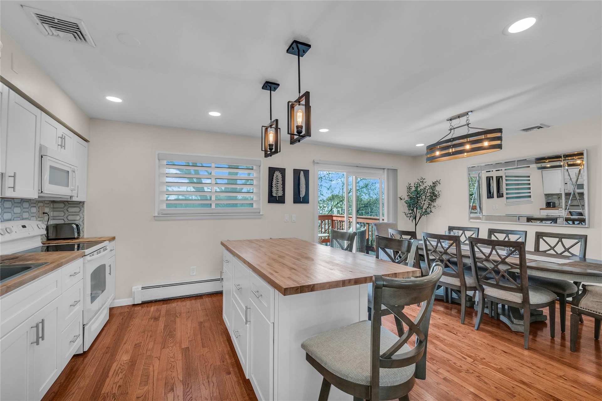 - Kitchen with wood counters, a kitchen bar, visible vents, white appliances, and baseboard heating