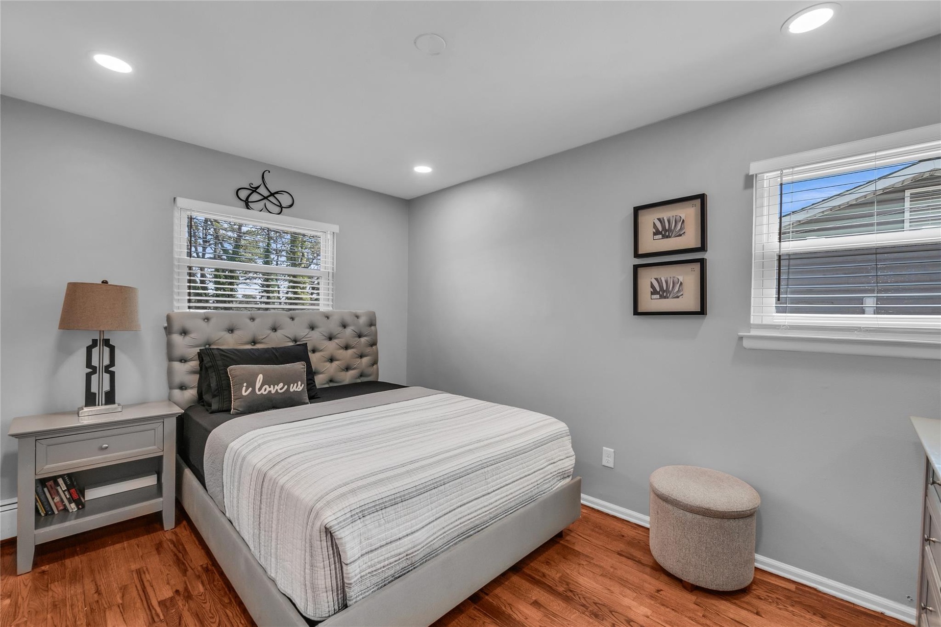 - Bedroom with baseboards, recessed lighting, and wood finished floors