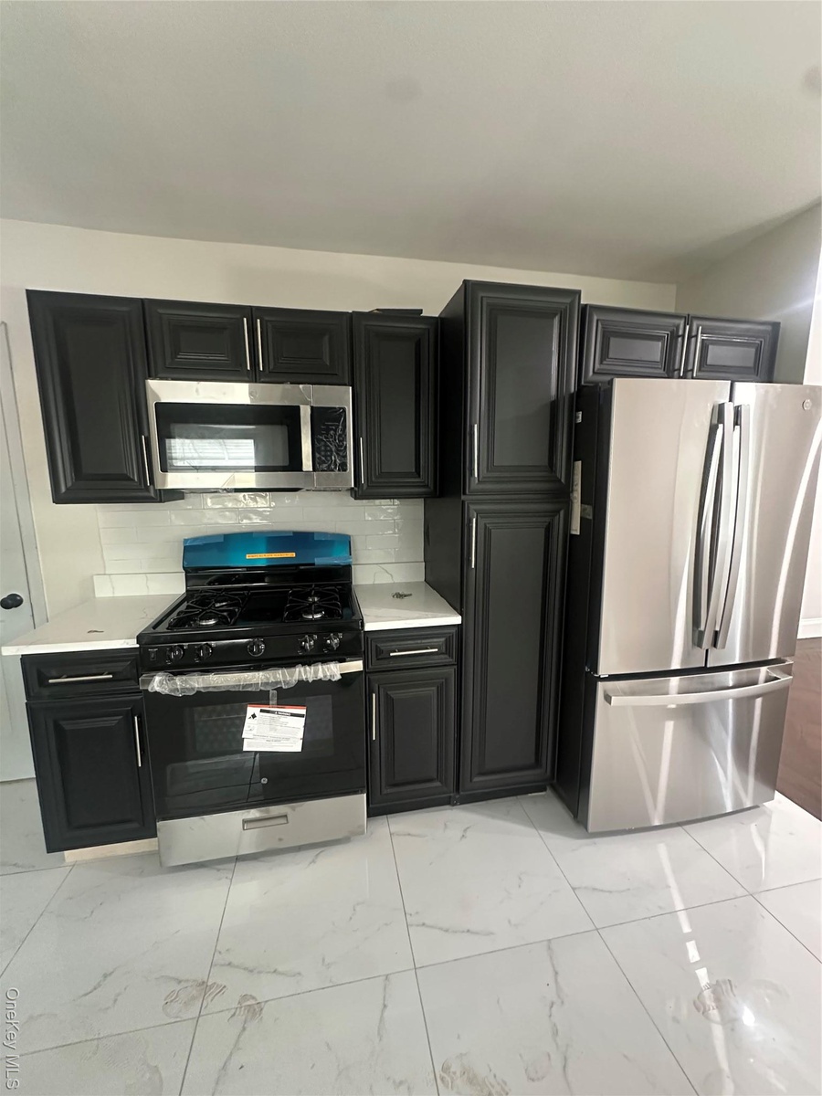 - Kitchen with stainless steel stove, fridge, backsplash, light marble finish floors, and dark cabinets