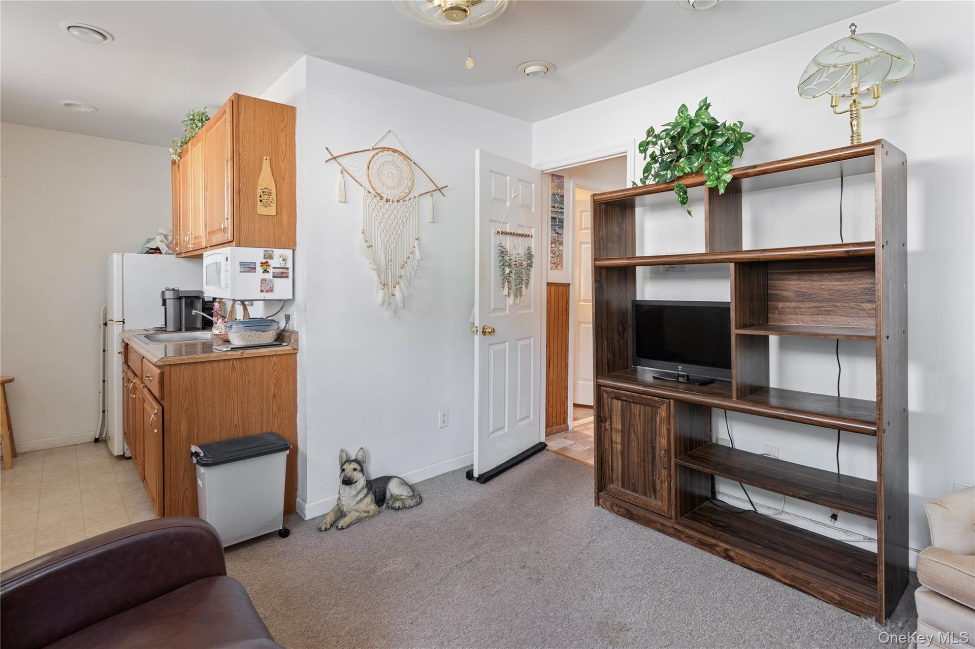 - Living room with light carpet and baseboards