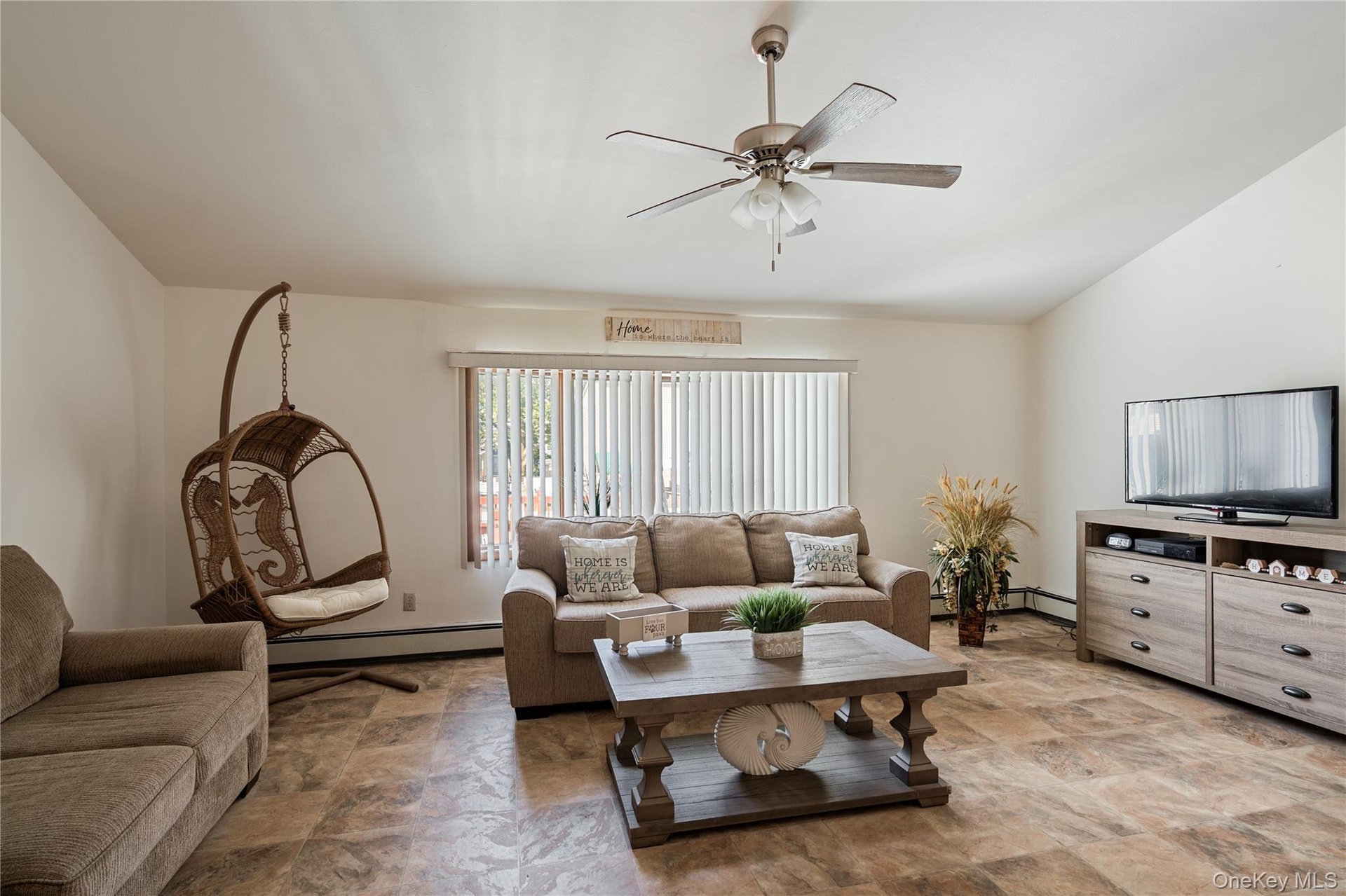 - Living room with stone finish floors, a ceiling fan, and a baseboard radiator
