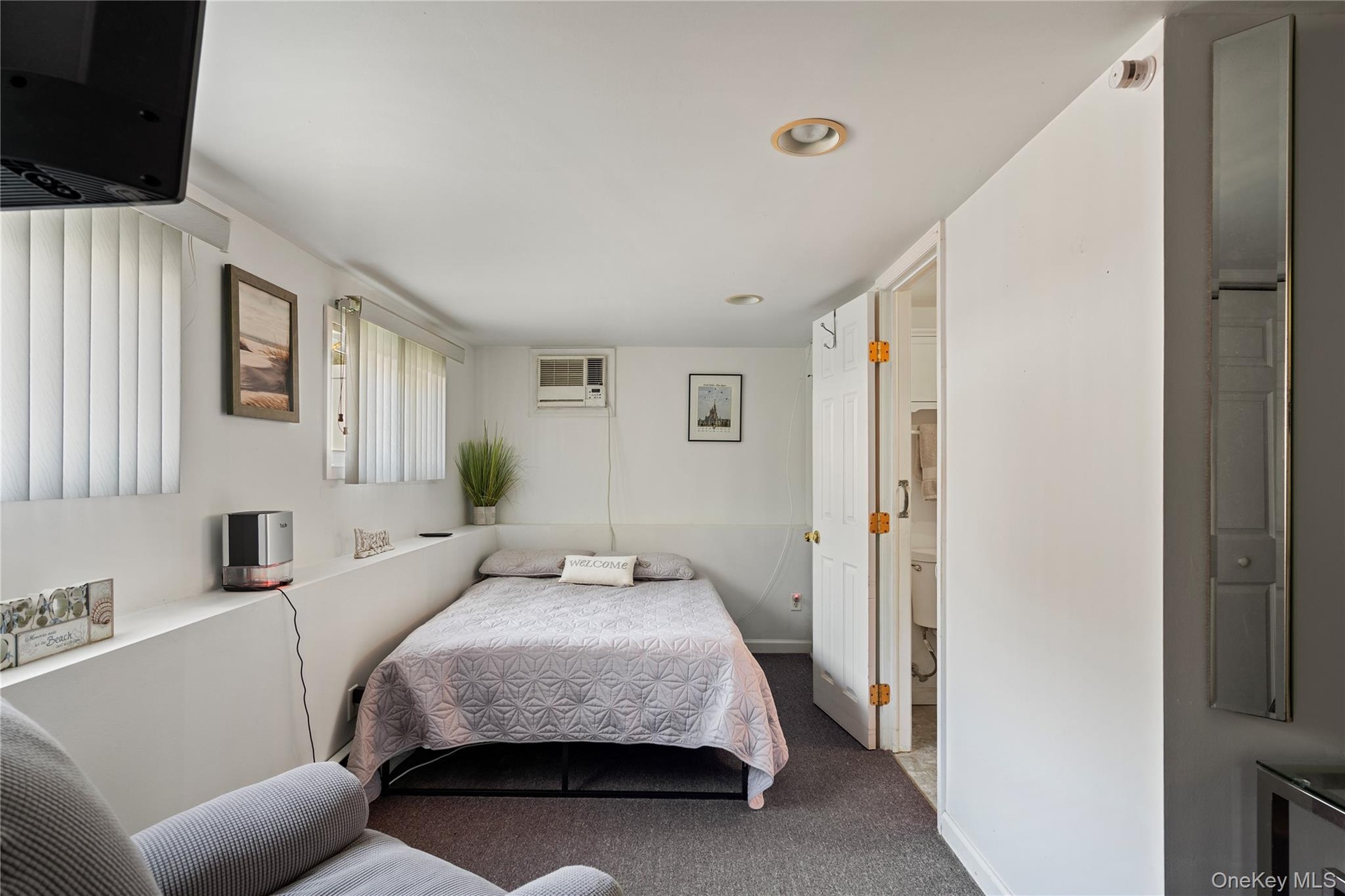 - Bedroom featuring carpet flooring, recessed lighting, and a wall mounted air conditioner