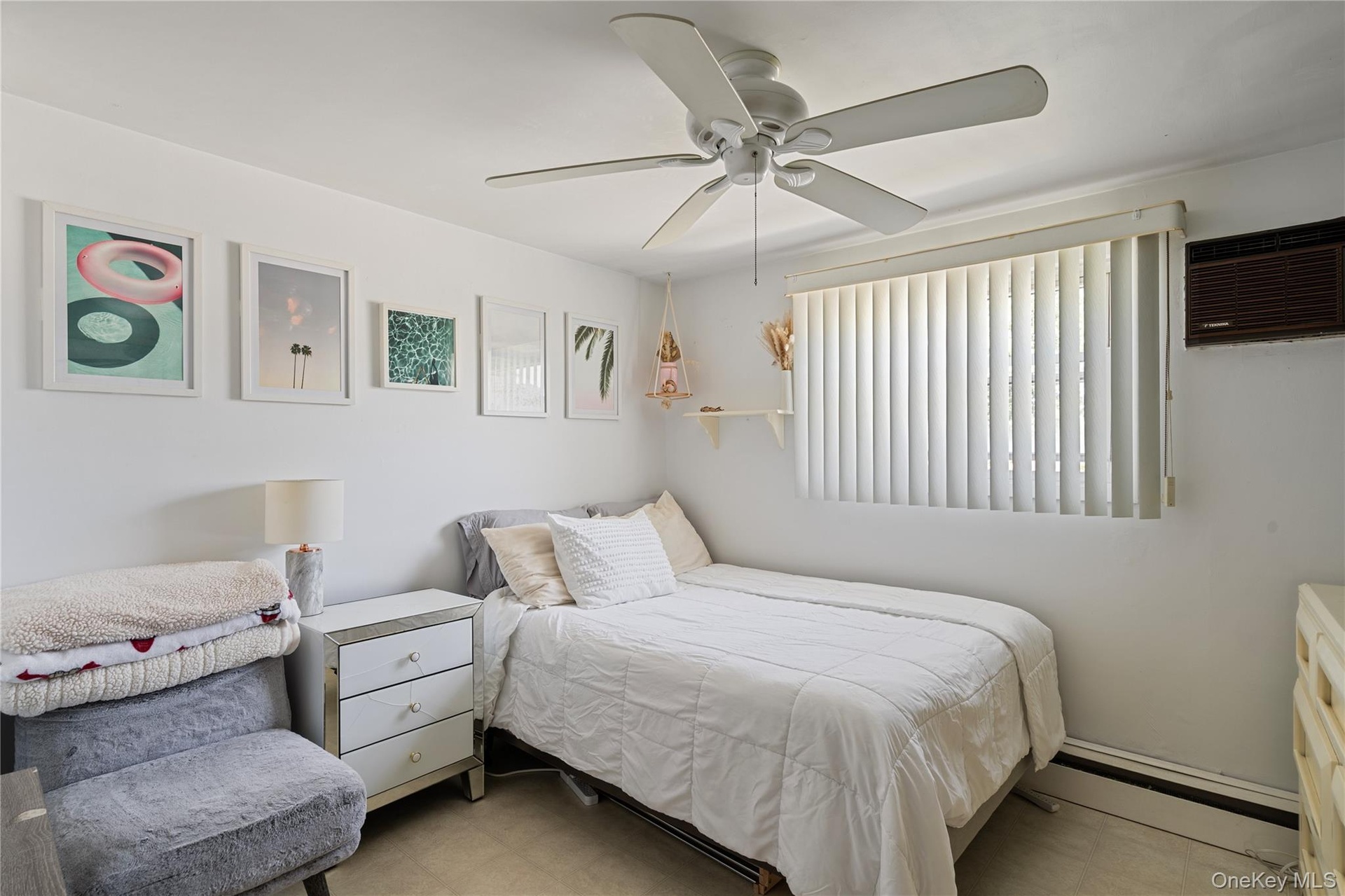 - Bedroom featuring a baseboard heating unit, a wall mounted AC, and a ceiling fan