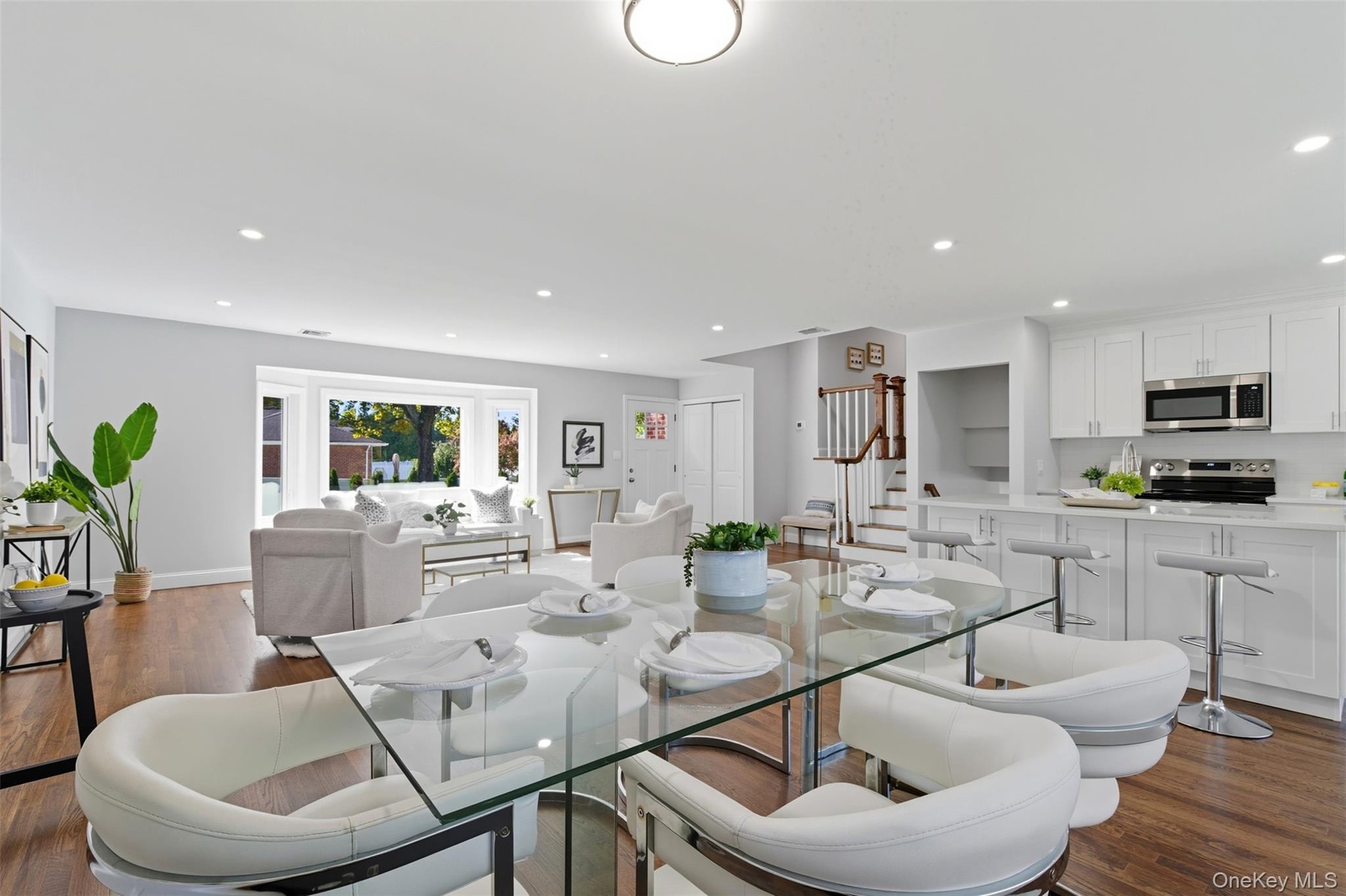 - Dining area with dark wood-style floors, recessed lighting, and stairway