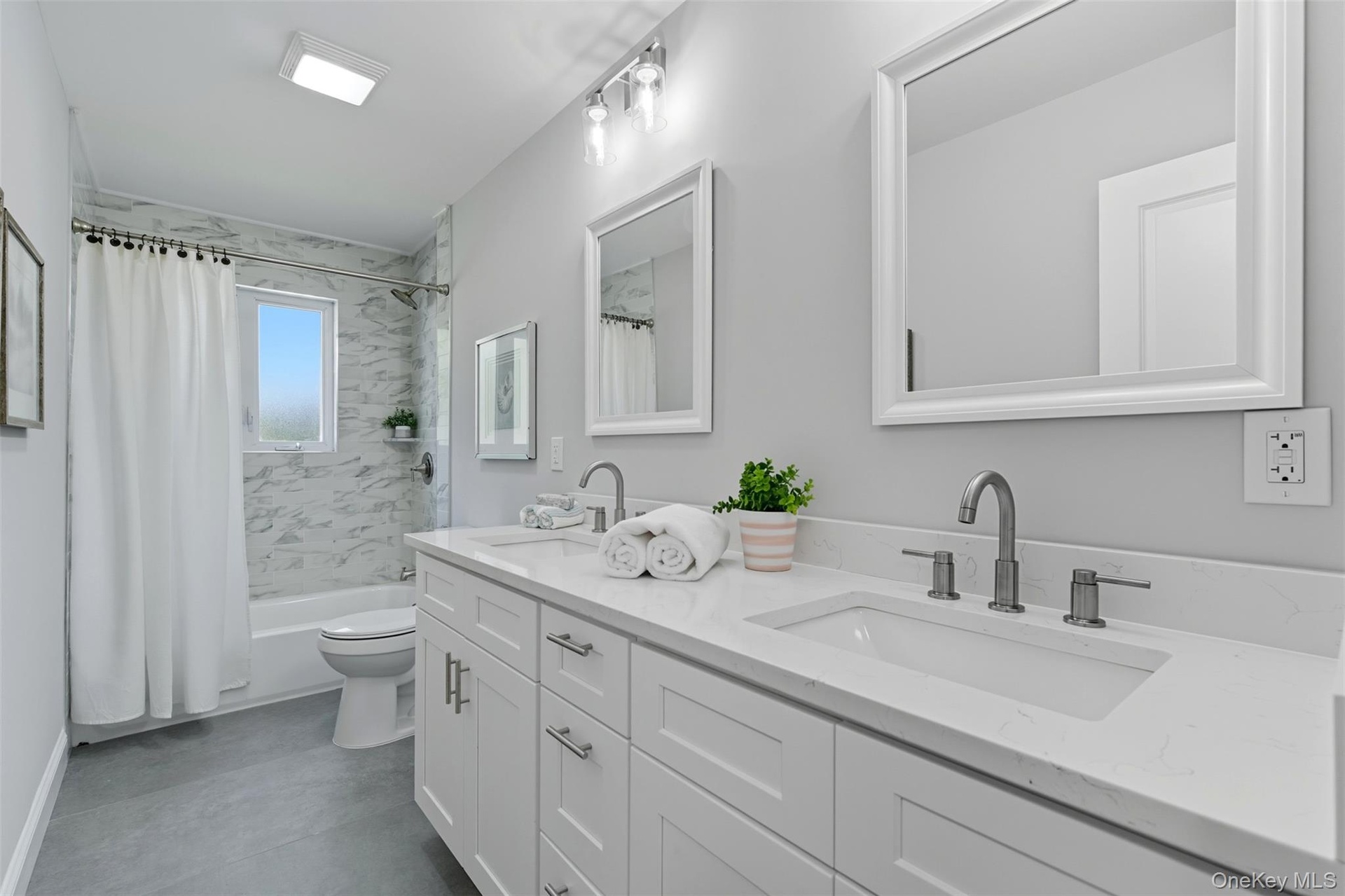 - Bathroom featuring shower / bath combination with curtain and double vanity