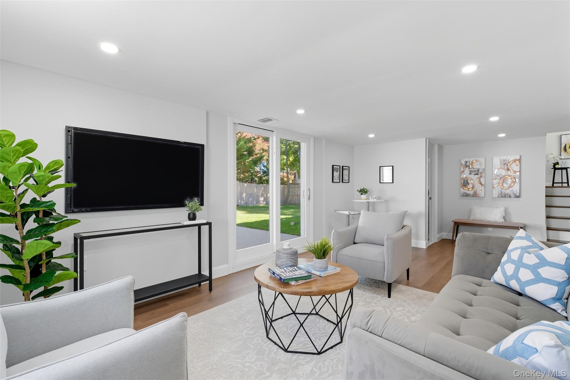 - Living area with dark wood finished floors, stairway, and recessed lighting