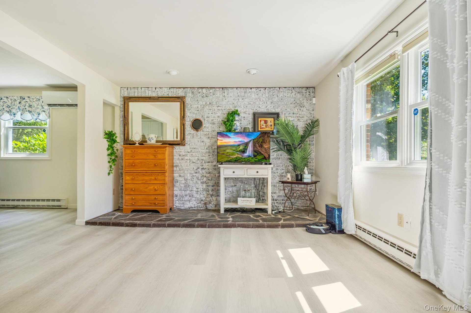 - Unfurnished living room with an accent wall, wood finished floors, a baseboard heating unit, a baseboard radiator, and an AC wall unit