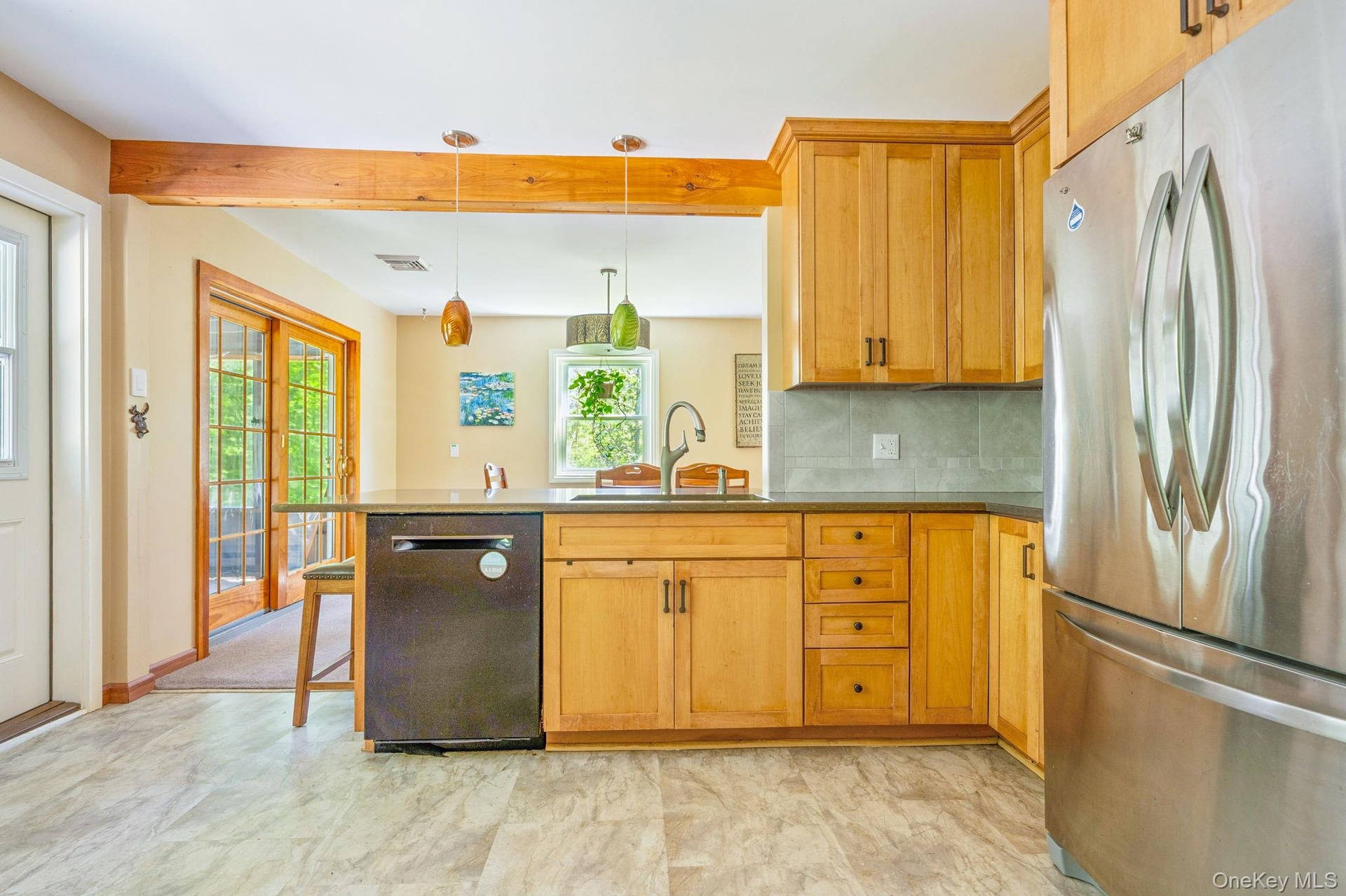 - Kitchen featuring freestanding refrigerator, a peninsula, dishwasher, backsplash, and hanging light fixtures