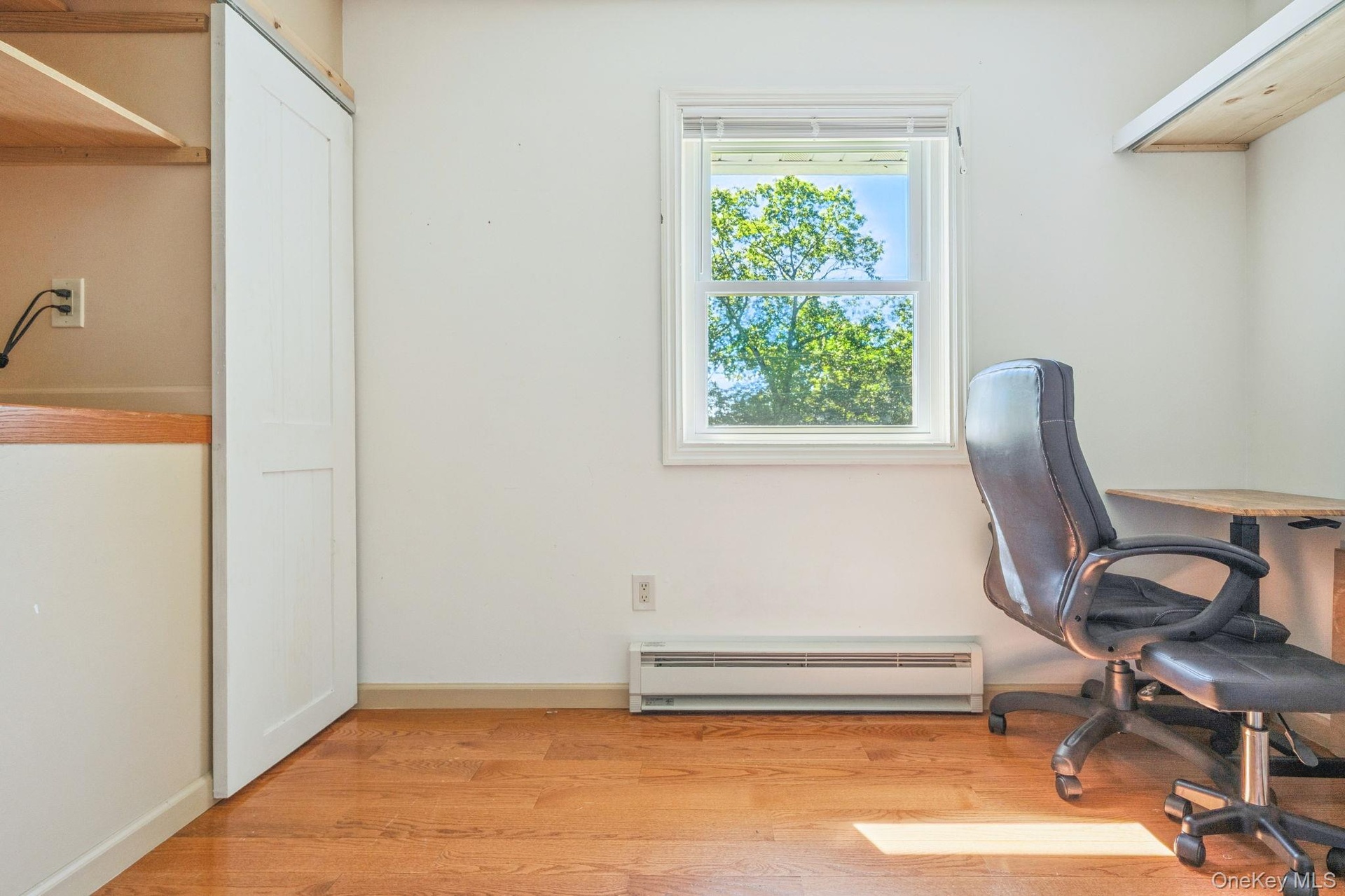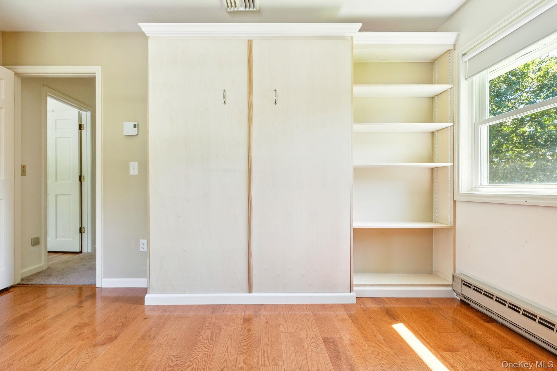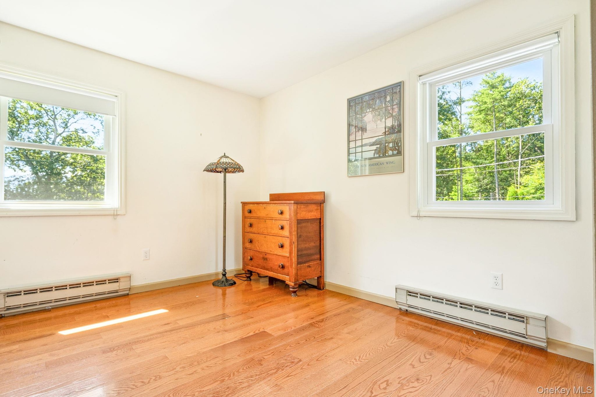 - Unfurnished room with a baseboard radiator, wood finished floors, and a baseboard heating unit