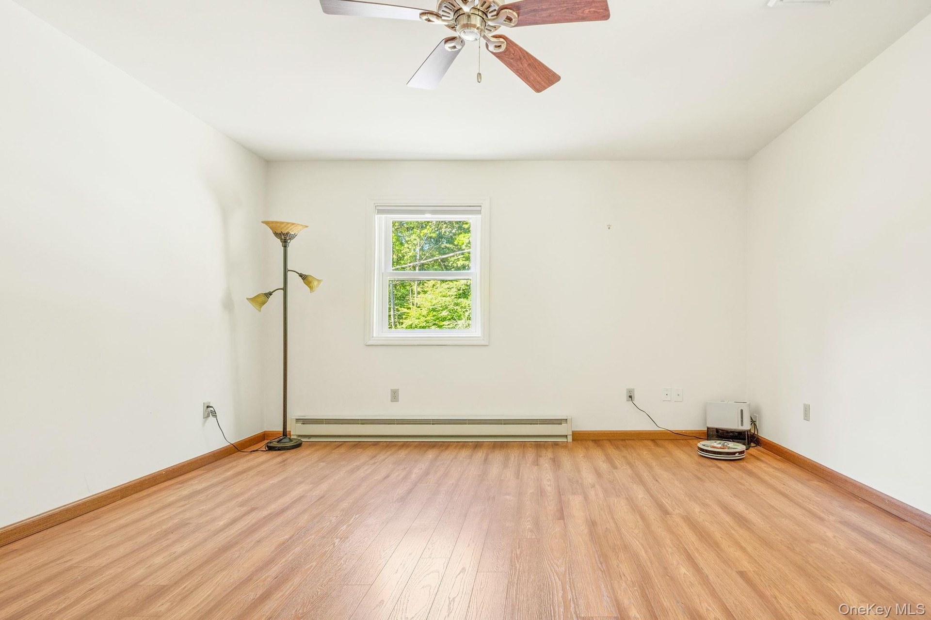 - Empty room featuring wood finished floors, a ceiling fan, and baseboard heating