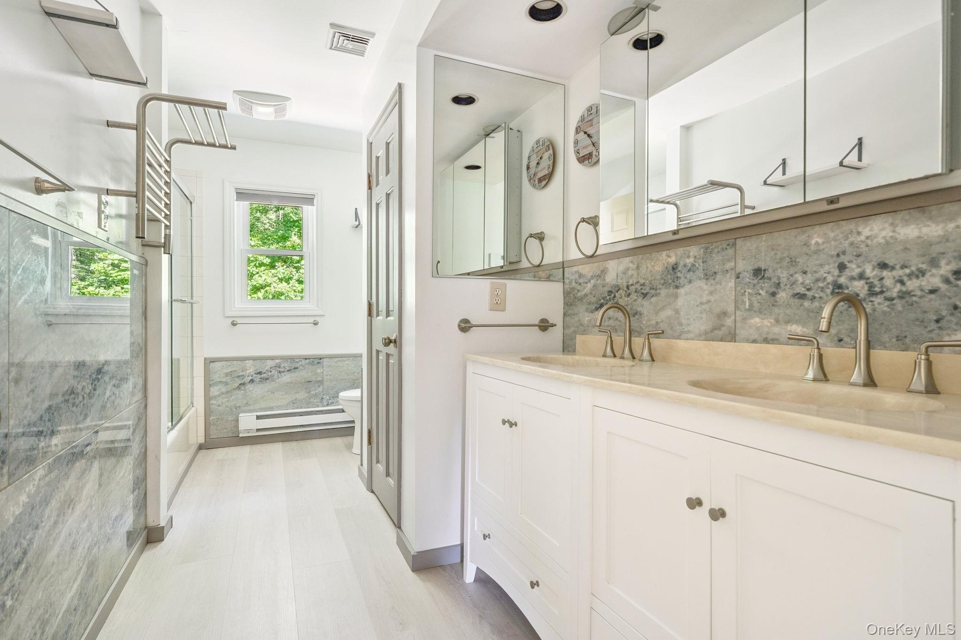 - Bathroom featuring a baseboard heating unit, double vanity, wood finished floors, shower / bath combination with glass door, and backsplash