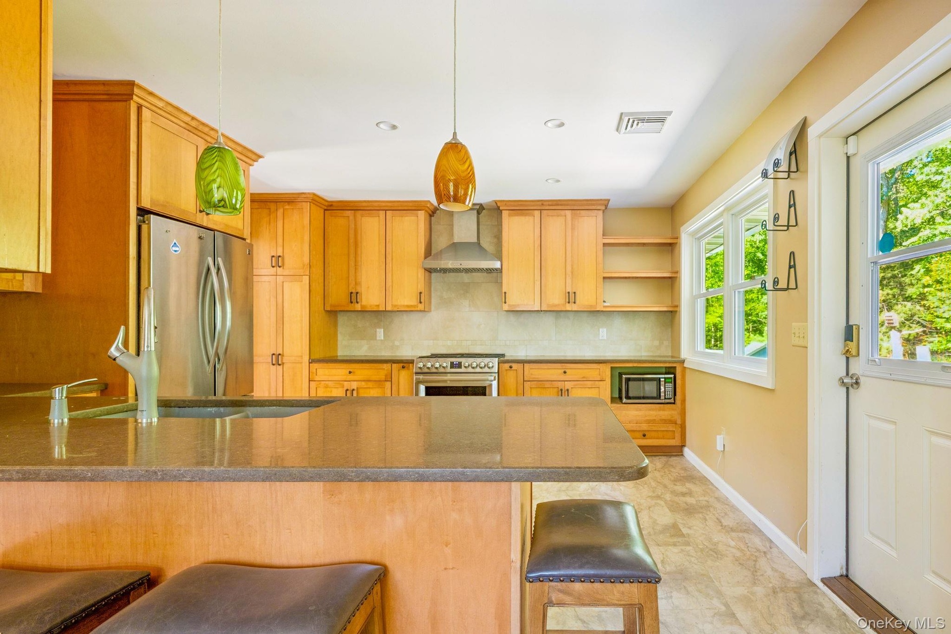 - Kitchen with a peninsula, stainless steel appliances, tasteful backsplash, wall chimney exhaust hood, and a breakfast bar