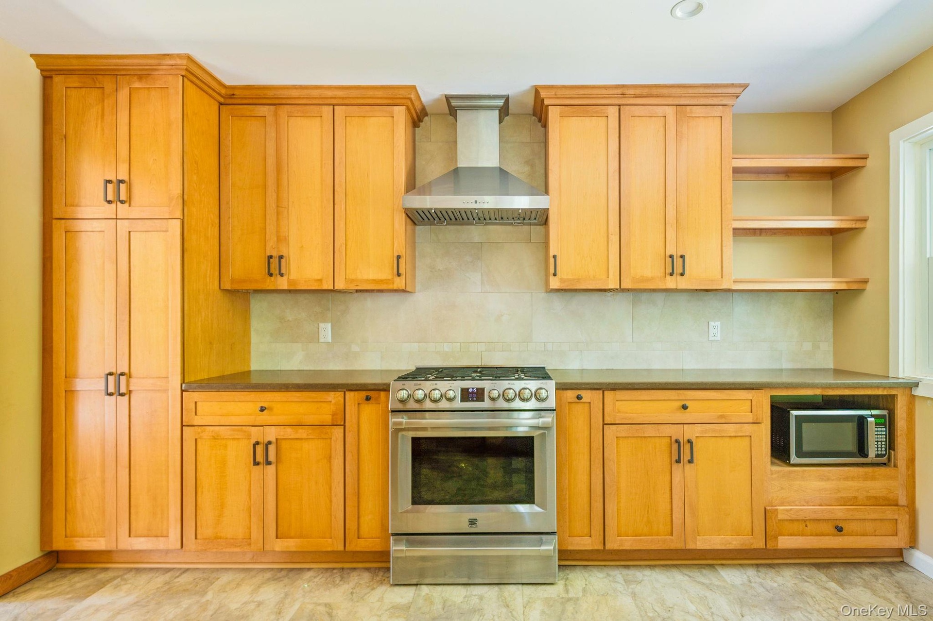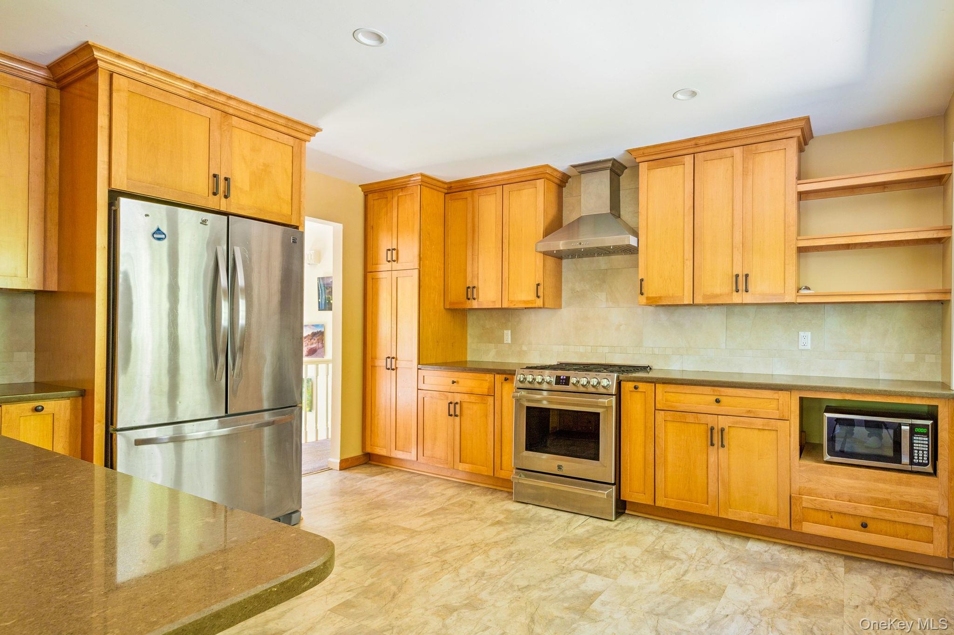 - Kitchen with stainless steel appliances, wall chimney exhaust hood, open shelves, decorative backsplash, and dark countertops