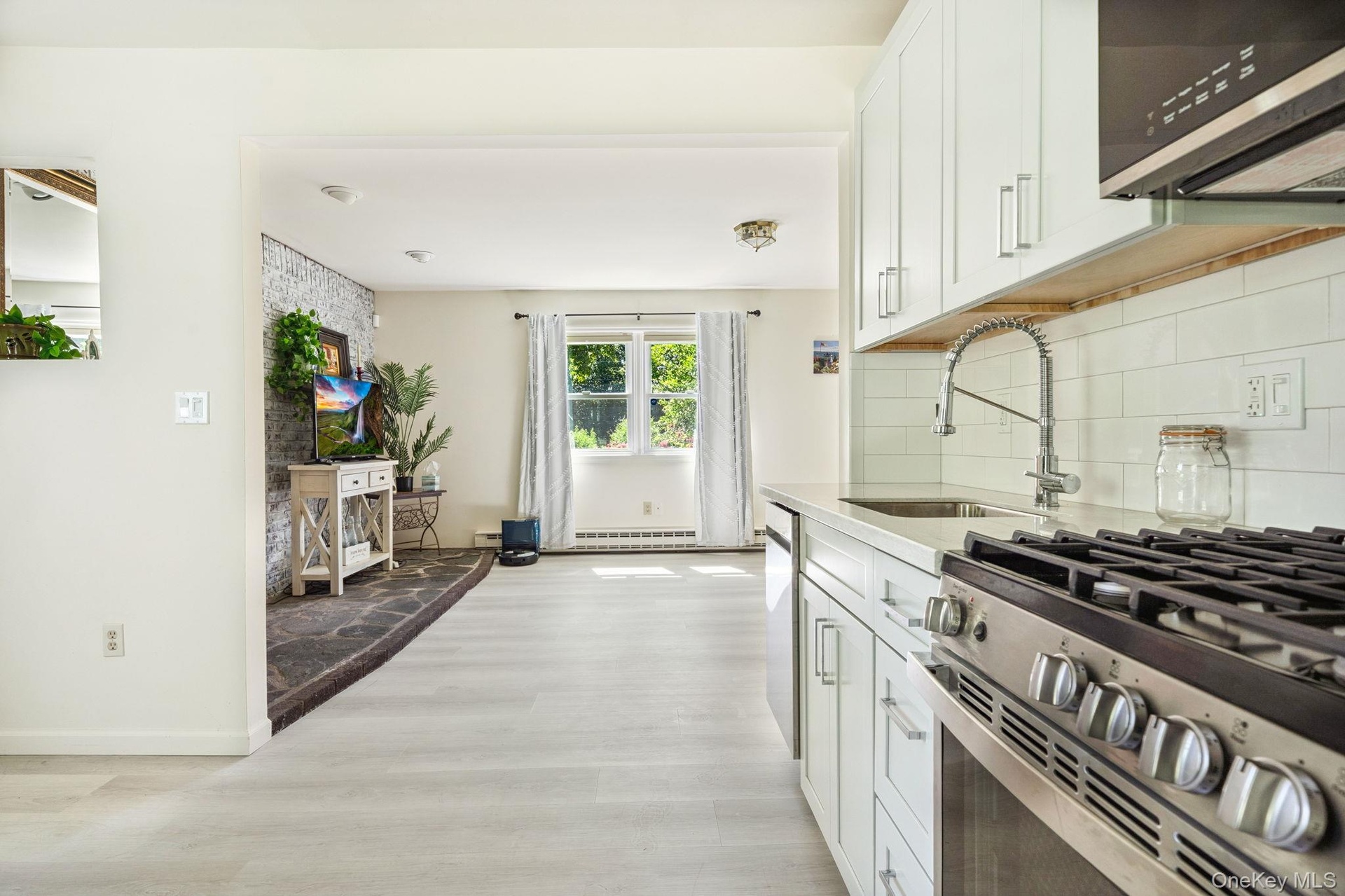 - Kitchen with stainless steel appliances, decorative backsplash, light wood-type flooring, white cabinetry, and light countertops