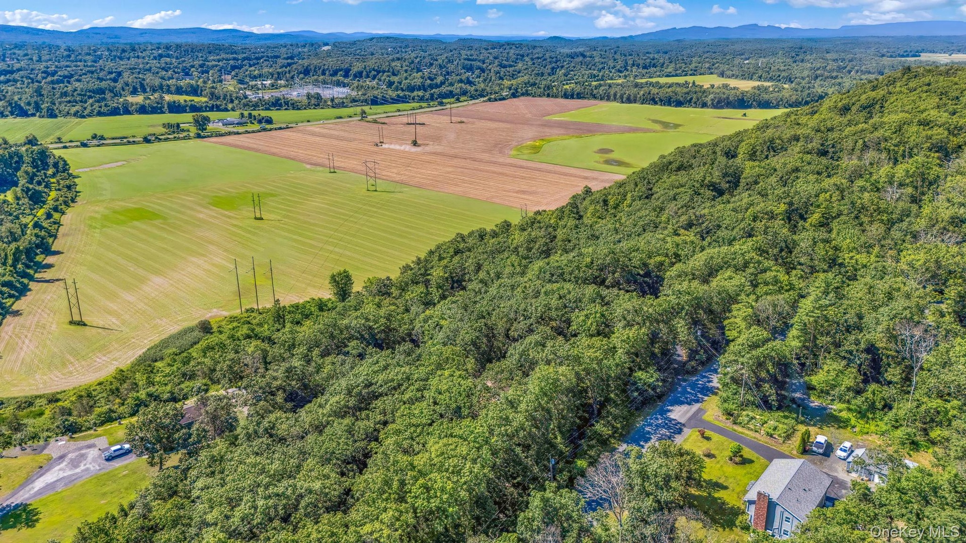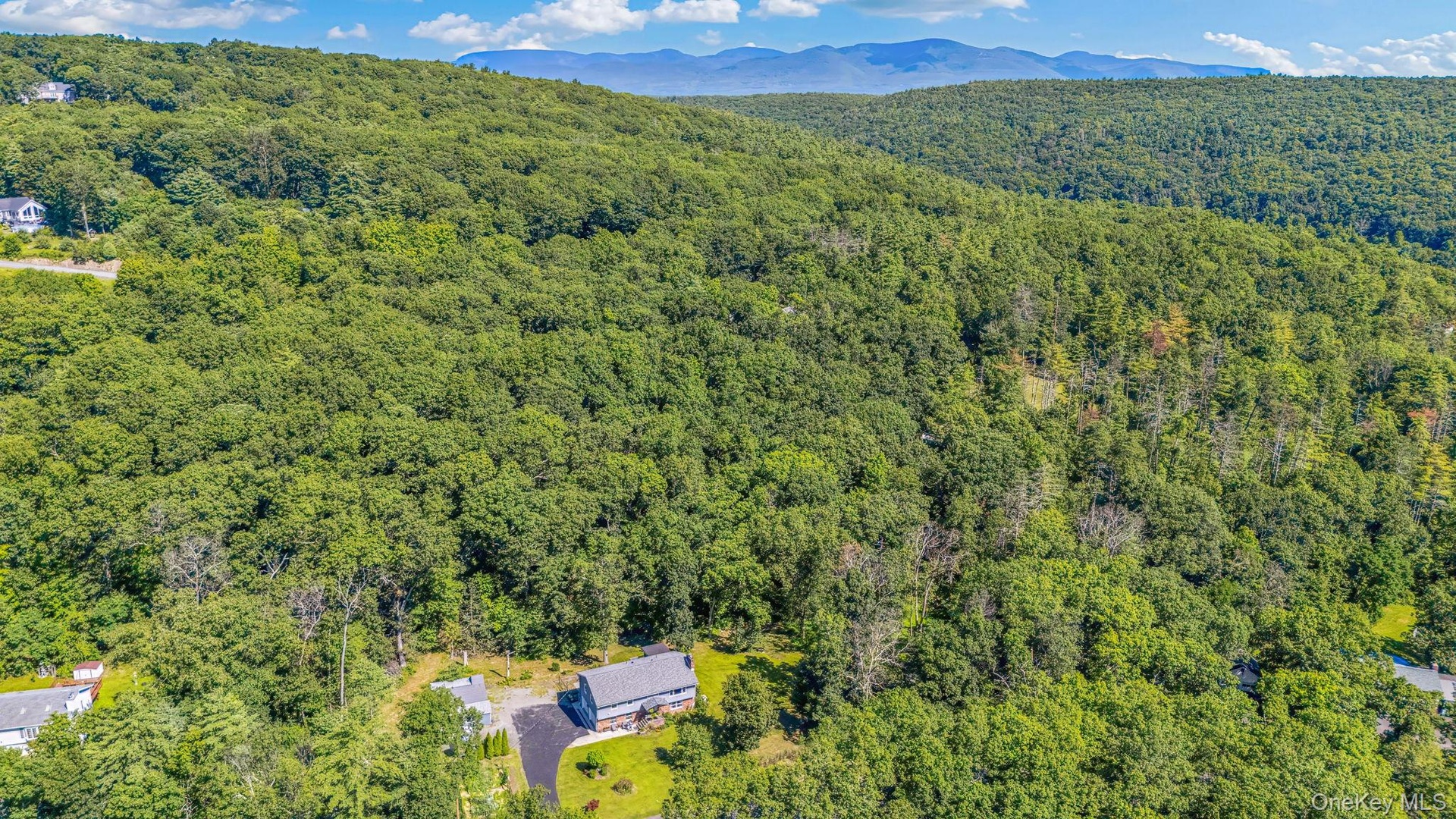 - Bird's eye view of a heavily wooded area and a mountain backdrop