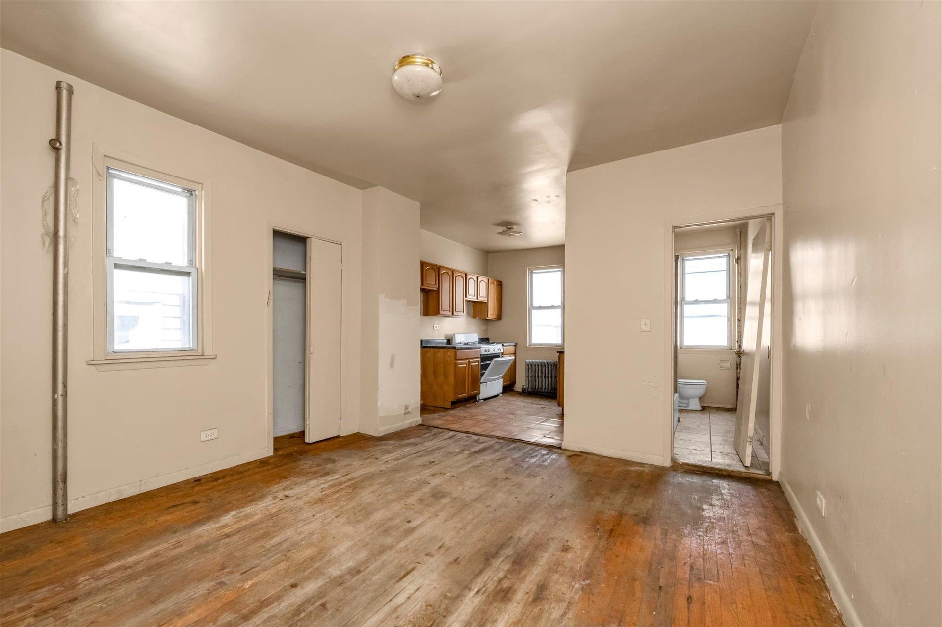 - Unfurnished living room featuring hardwood / wood-style floors and radiator heating unit