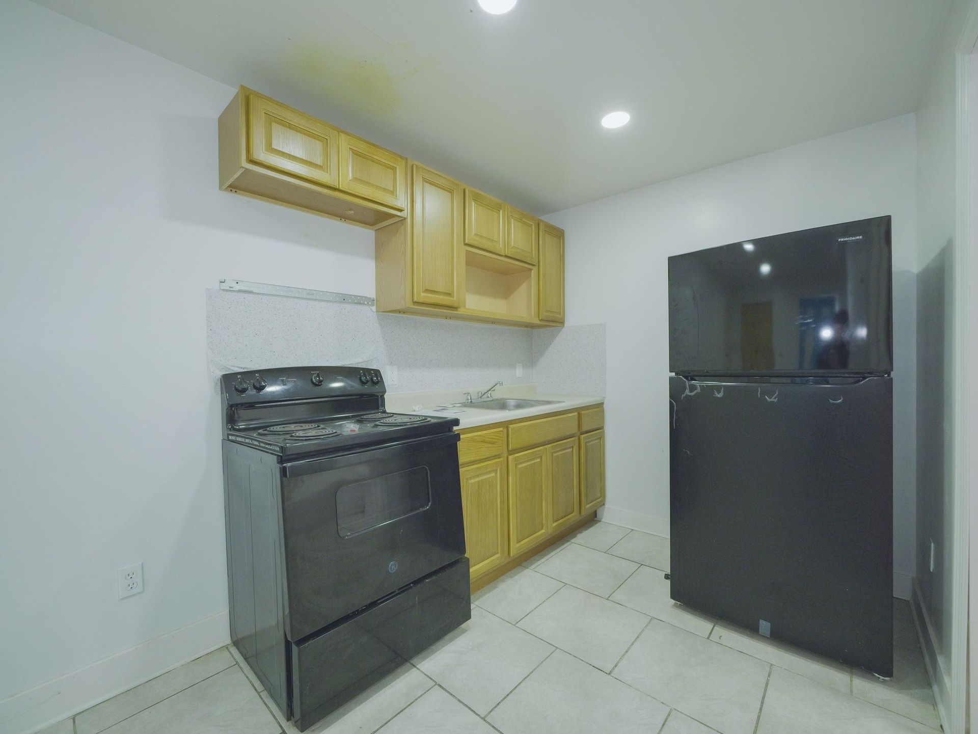 - Kitchen featuring black range with electric cooktop, freestanding refrigerator, light wood-style floors, light countertops