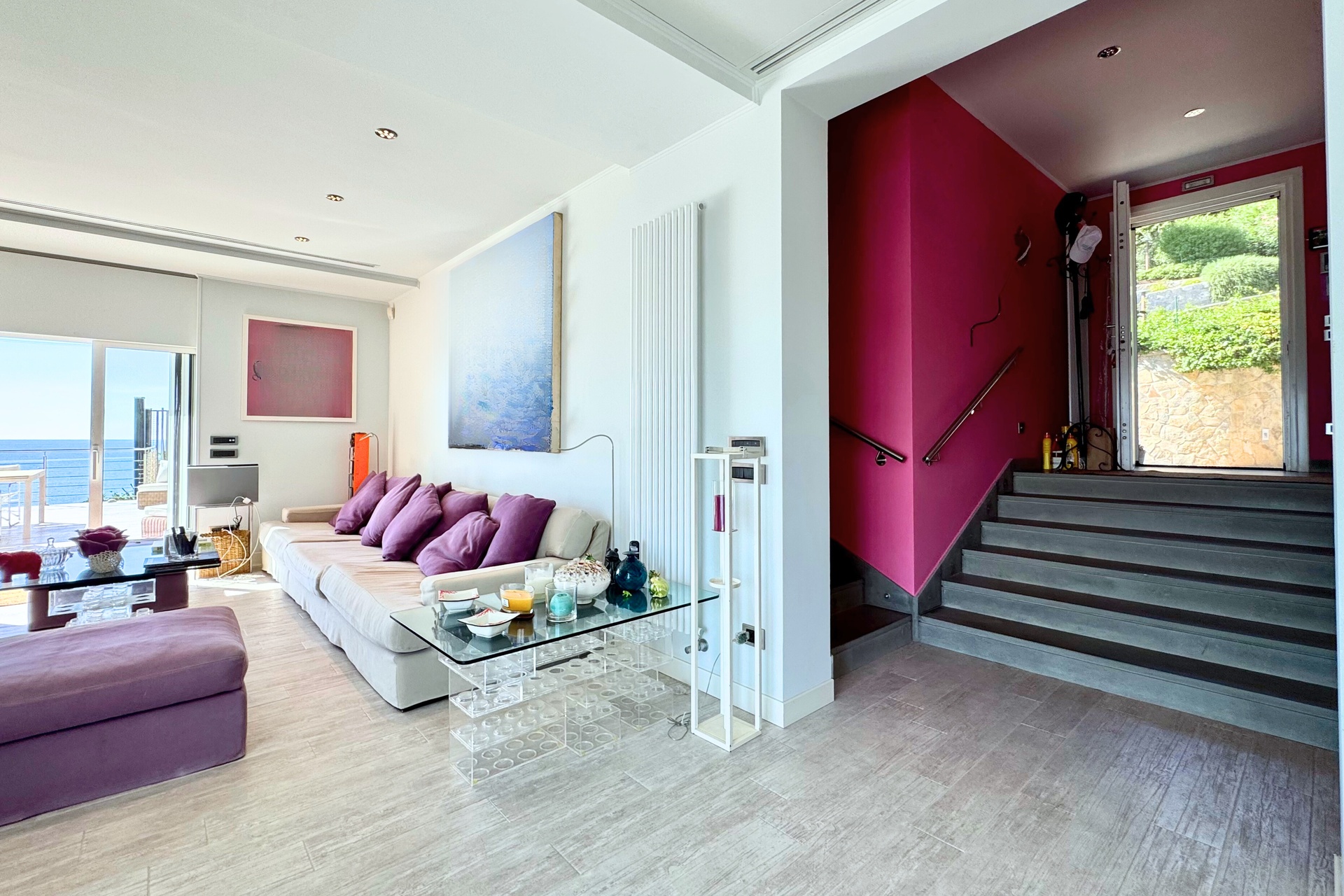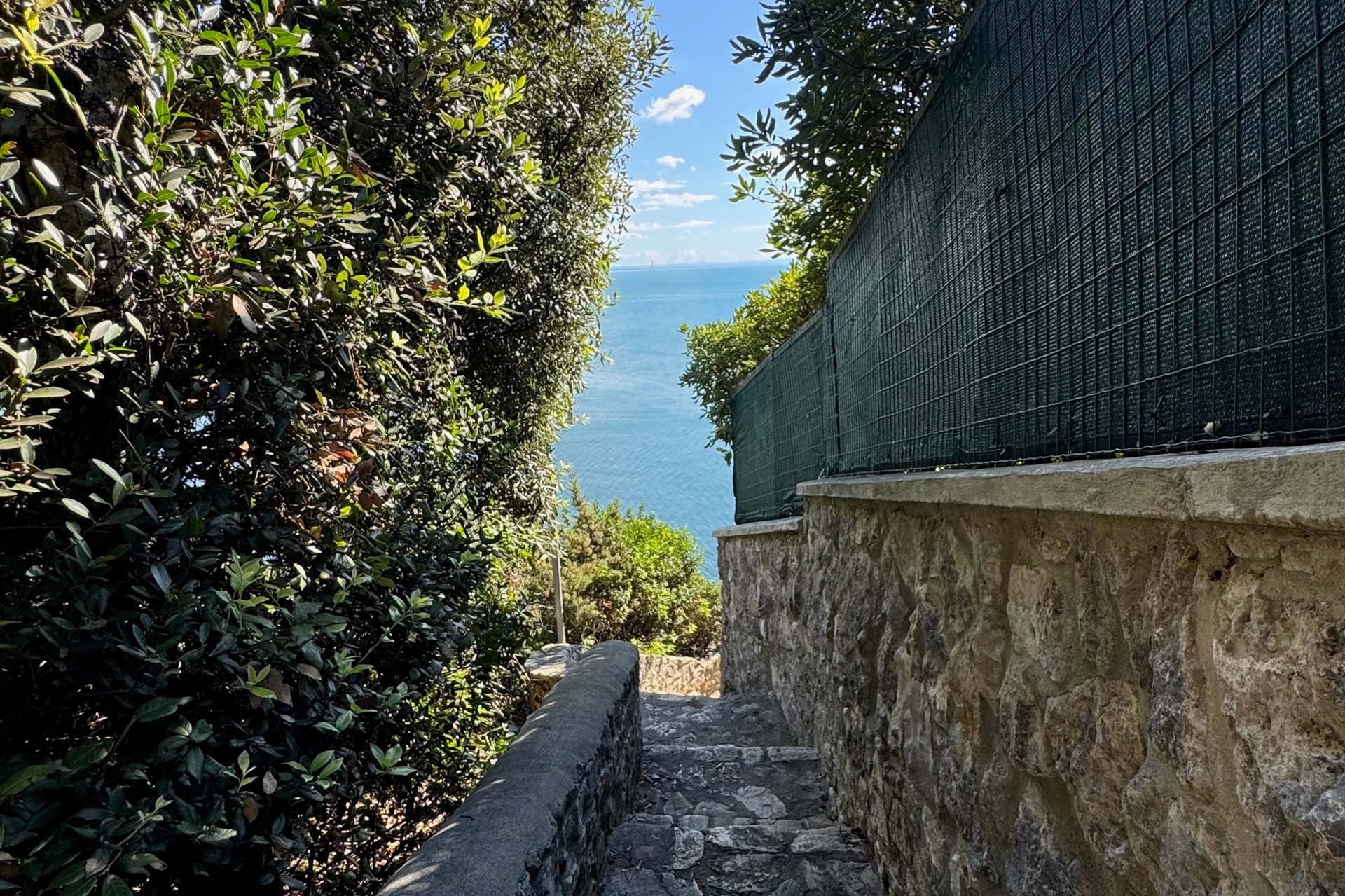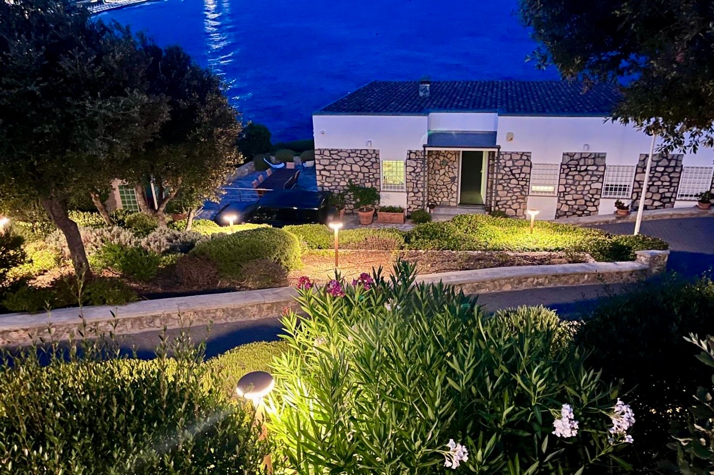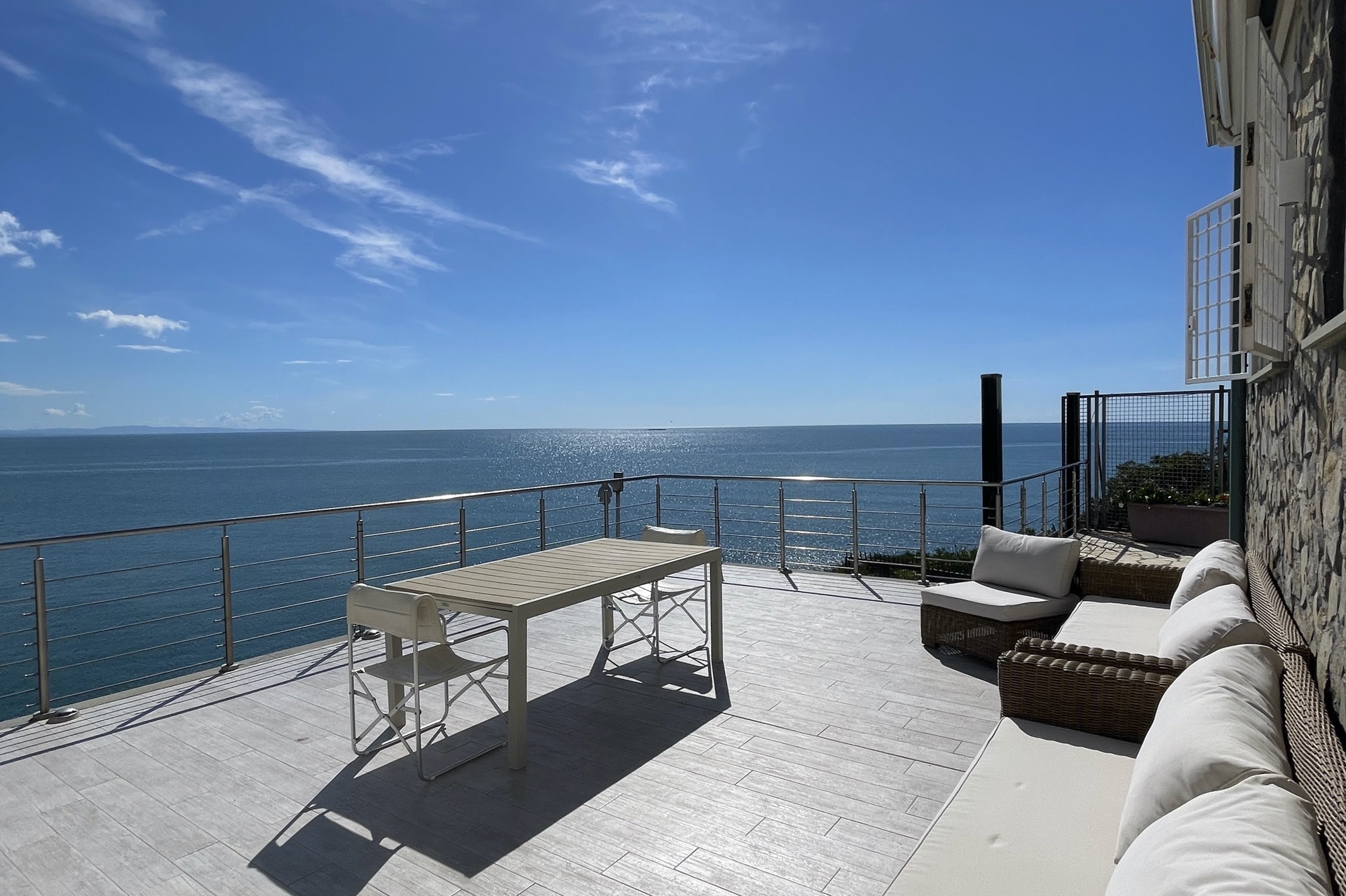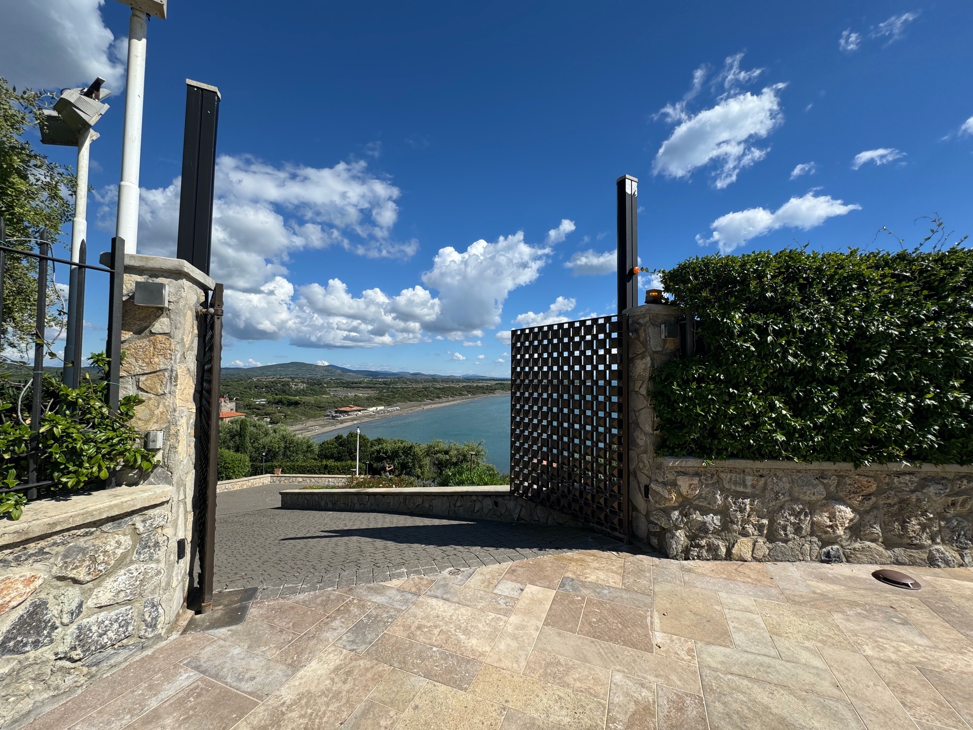 The ground floor features a bright living room with a fireplace and a panoramic terrace, making it an ideal space for entertaining or enjoying the remarkable view. The fully equipped kitchen, featuring a large refrigerator, a professional ice maker, and a wine cellar, is perfectly suited for food and wine enthusiasts. The three bedrooms, each with an en suite bathroom, ensure privacy and comfort. The lower level includes a guest room with a private bathroom and independent access, as well as a room for service staff, a laundry area, and space for technical equipment. These spaces are managed via home automation technology for easy remote control. The total gross floor area, covering main rooms, ancillary spaces, and both direct and indirect areas, measures 280 square meters, complemented by 86 square meters of terraces, balconies, and porches. The villa is complemented by a 1,234-square-meter manicured garden, accessible via a driveway ramp that leads from the electric entry gate to the villa's entrance. There is space for a lovely swimming pool, though the sea is very close, and a staircase connects the property to the path that leads to the nearby Tagliata Beach.