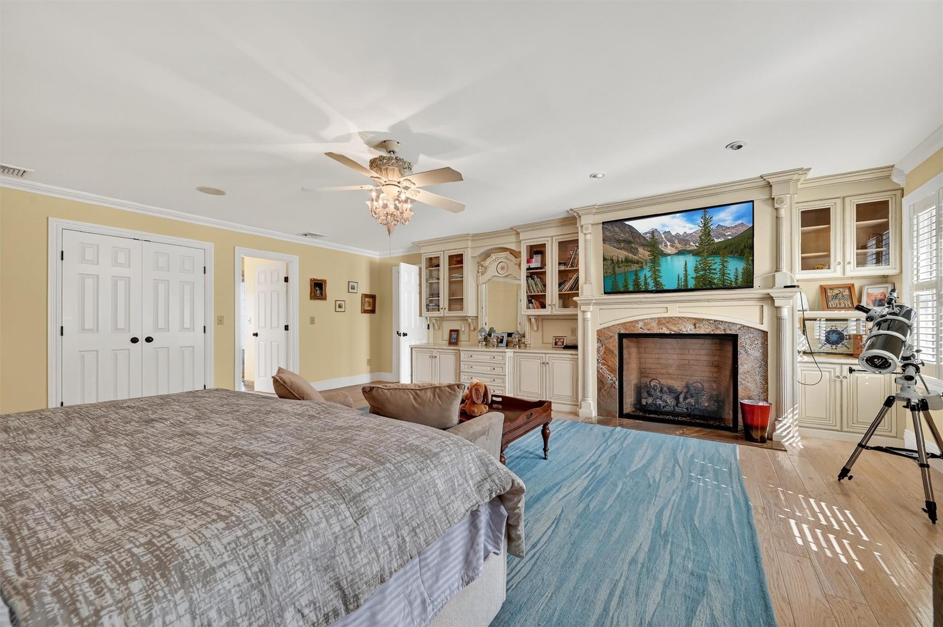 - Bedroom with a high end fireplace, light wood-type flooring, ornamental molding, and a ceiling fan
